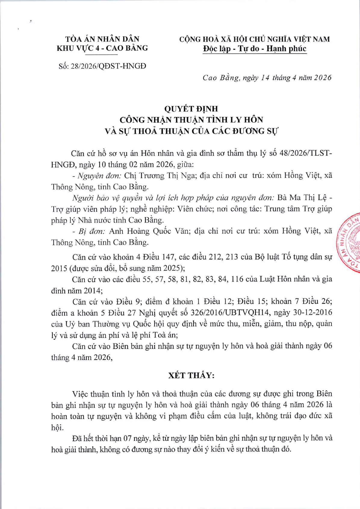 Quyết định số 28/2026/QĐST-HNGĐ ngày 14/04/2026 của Tòa án nhân dân khu vực 4 - Cao Bằng, tỉnh Cao Bằng về vụ án ly hôn về mâu thuẫn gia đình