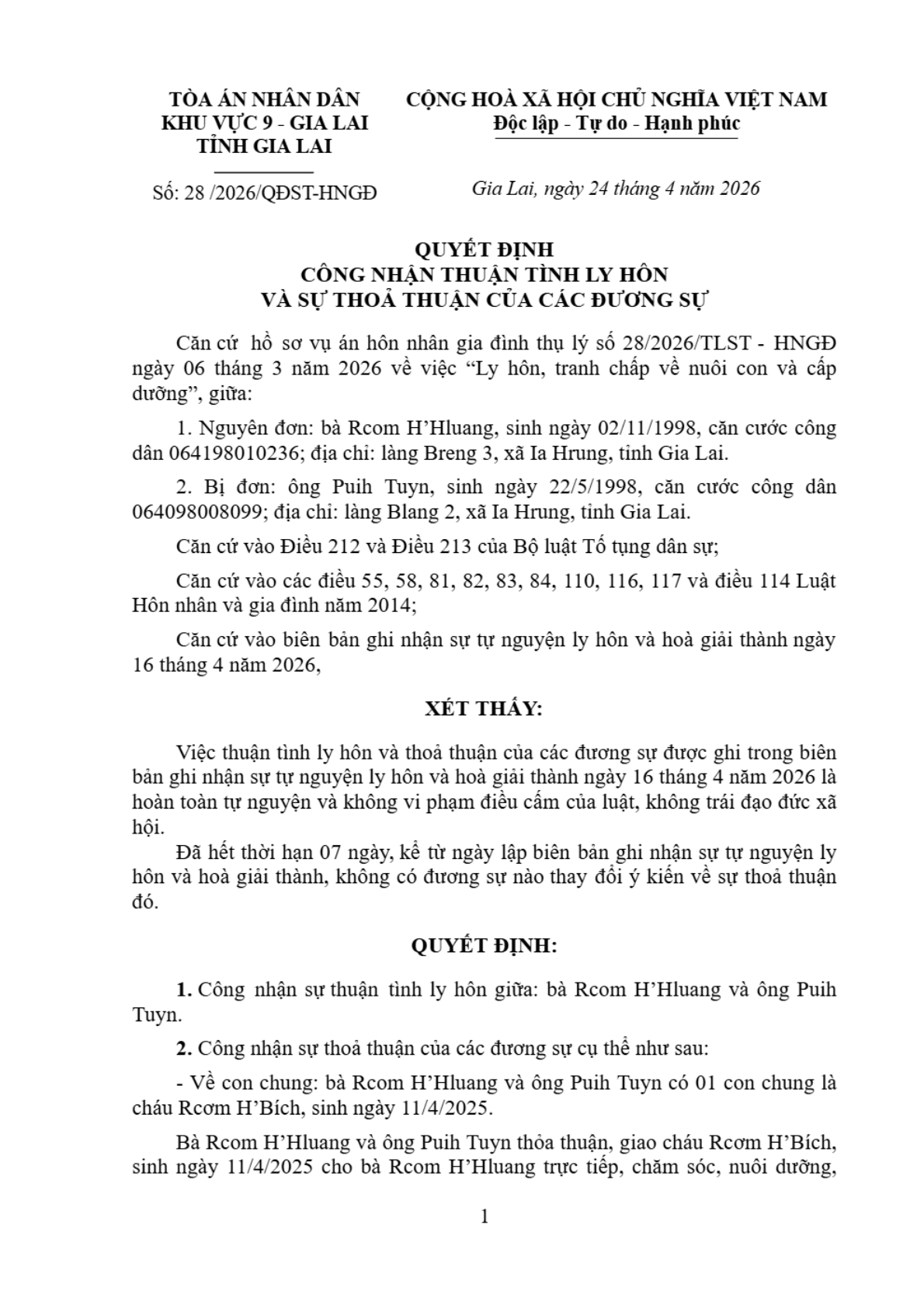 Quyết định số 28/2026/QĐST-HNGĐ ngày 24/04/2026 của Tòa án nhân dân khu vực 9 - Gia Lai, tỉnh Gia Lai về vụ án ly hôn về mâu thuẫn gia đình