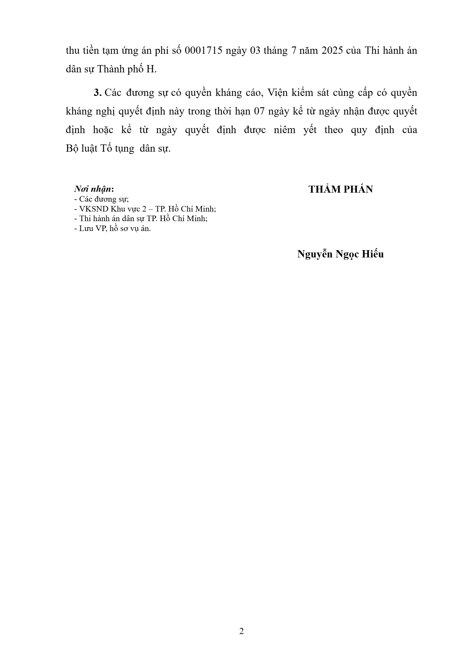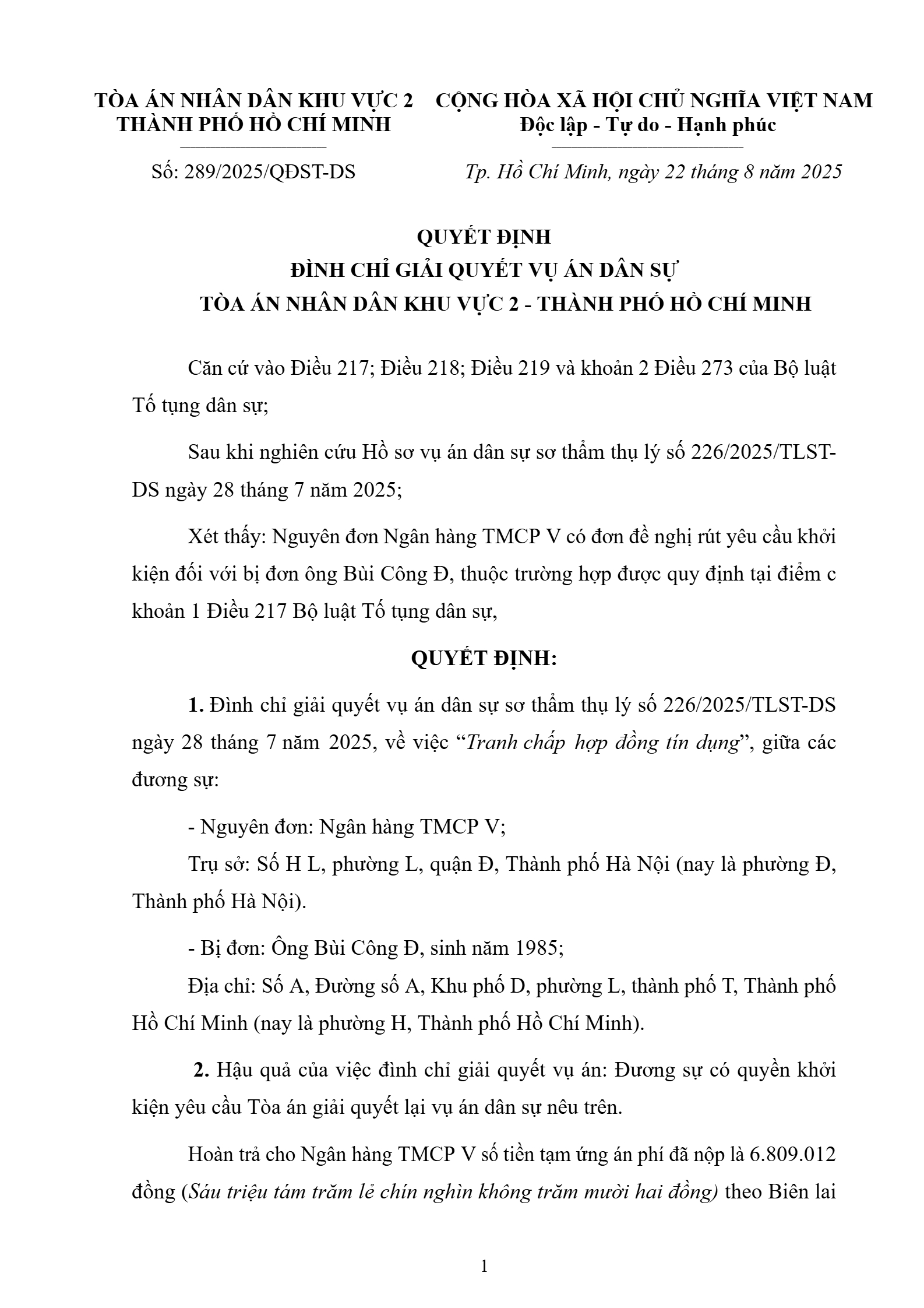 Quyết định số 289/2025/QĐST-DS ngày 22/08/2025 của Tòa án nhân dân khu vực 2 - Hồ Chí Minh, TP. Hồ Chí Minh về tranh chấp hợp đồng tín dụng