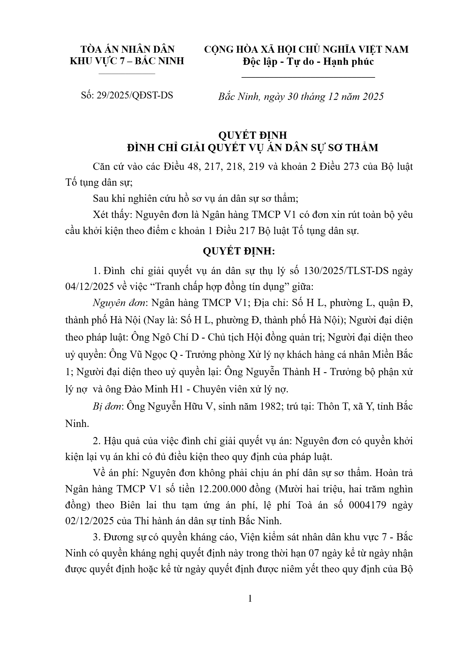 Quyết định số 29/2025/QĐST-DS ngày 30/12/2025 của Tòa án nhân dân khu vực 7 - Bắc Ninh, tỉnh Bắc Ninh về tranh chấp hợp đồng tín dụng
