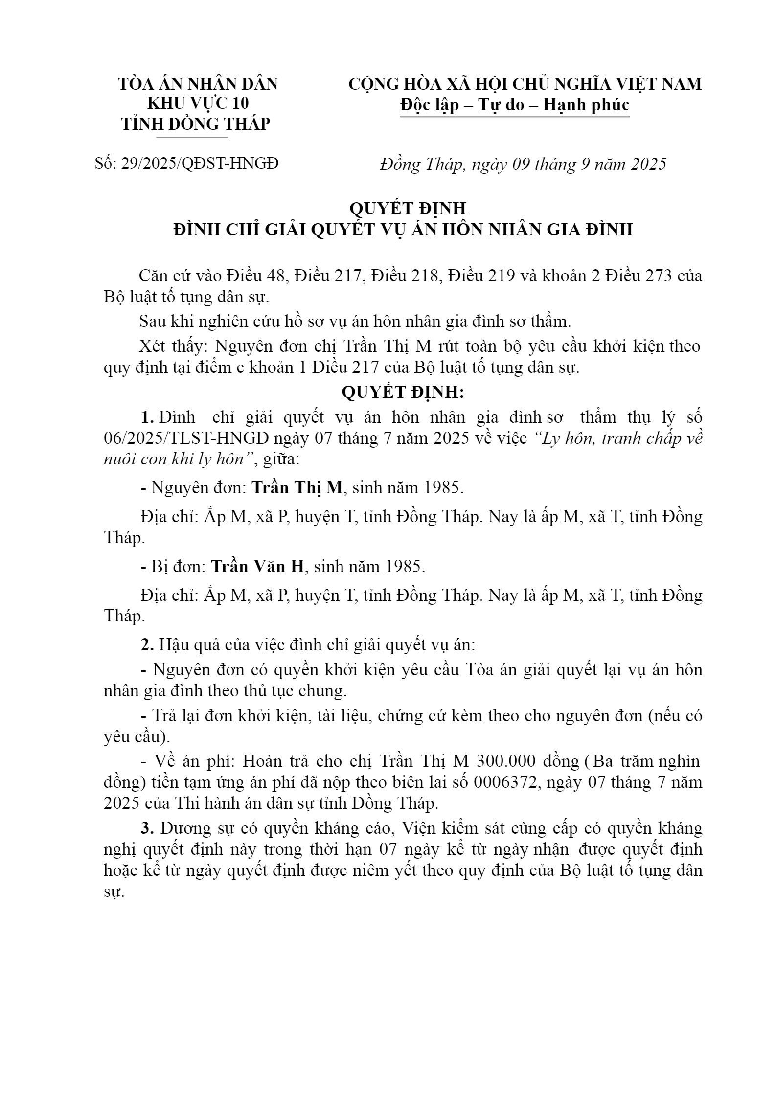Quyết định số 29/2025/QĐST-HNGĐ ngày 09/09/2025 của Tòa án nhân dân khu vực 10 - Đồng Tháp, tỉnh Đồng Tháp về vụ án ly hôn về mâu thuẫn gia đình