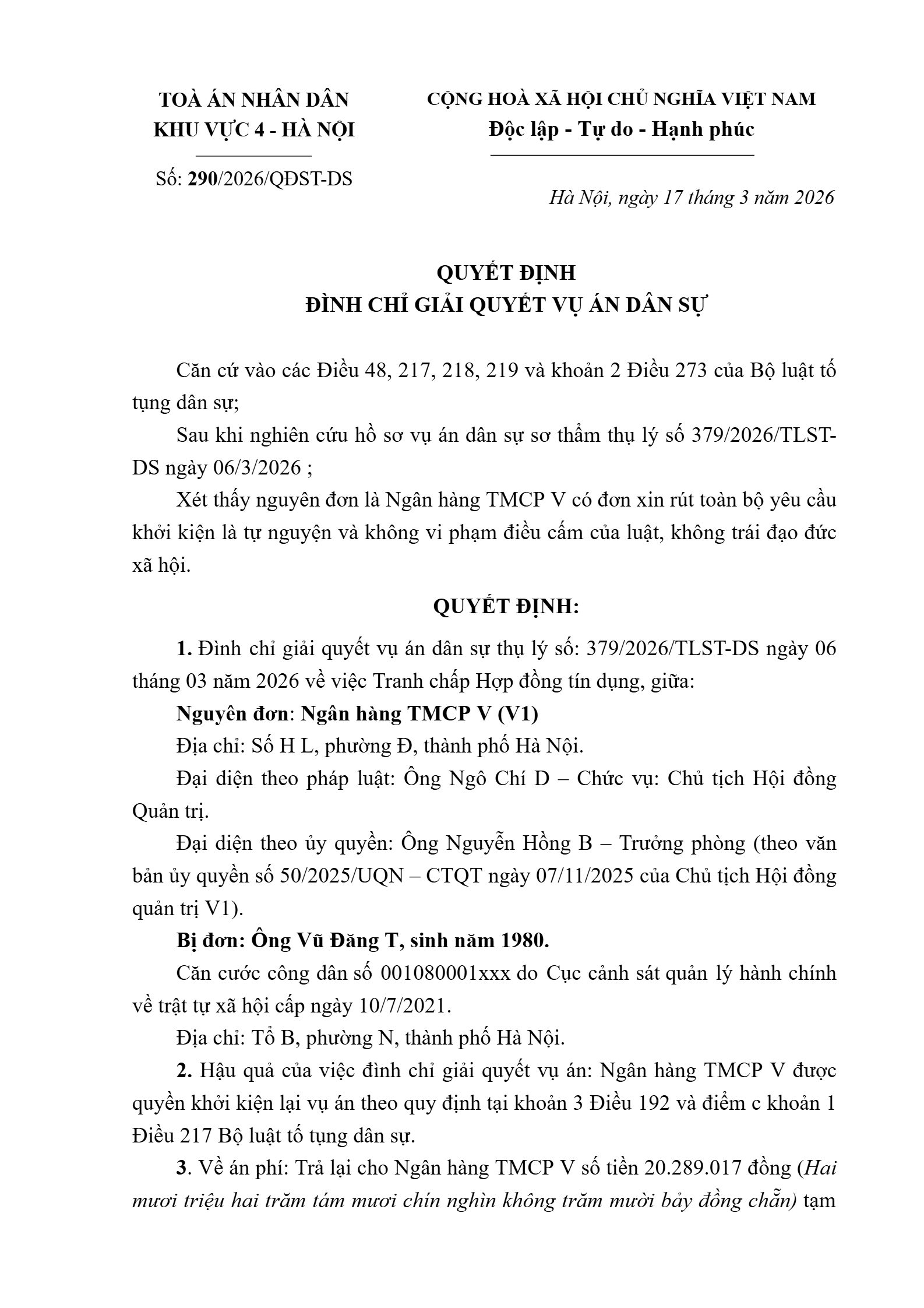 | Tên Quyết định: | Quyết định số 290/2026/QĐST-DS ngày 17/03/2026 của Tòa án nhân dân khu vực 4 - Hà Nội, TP. Hà Nội về tranh chấp hợp đồng tín dụng |