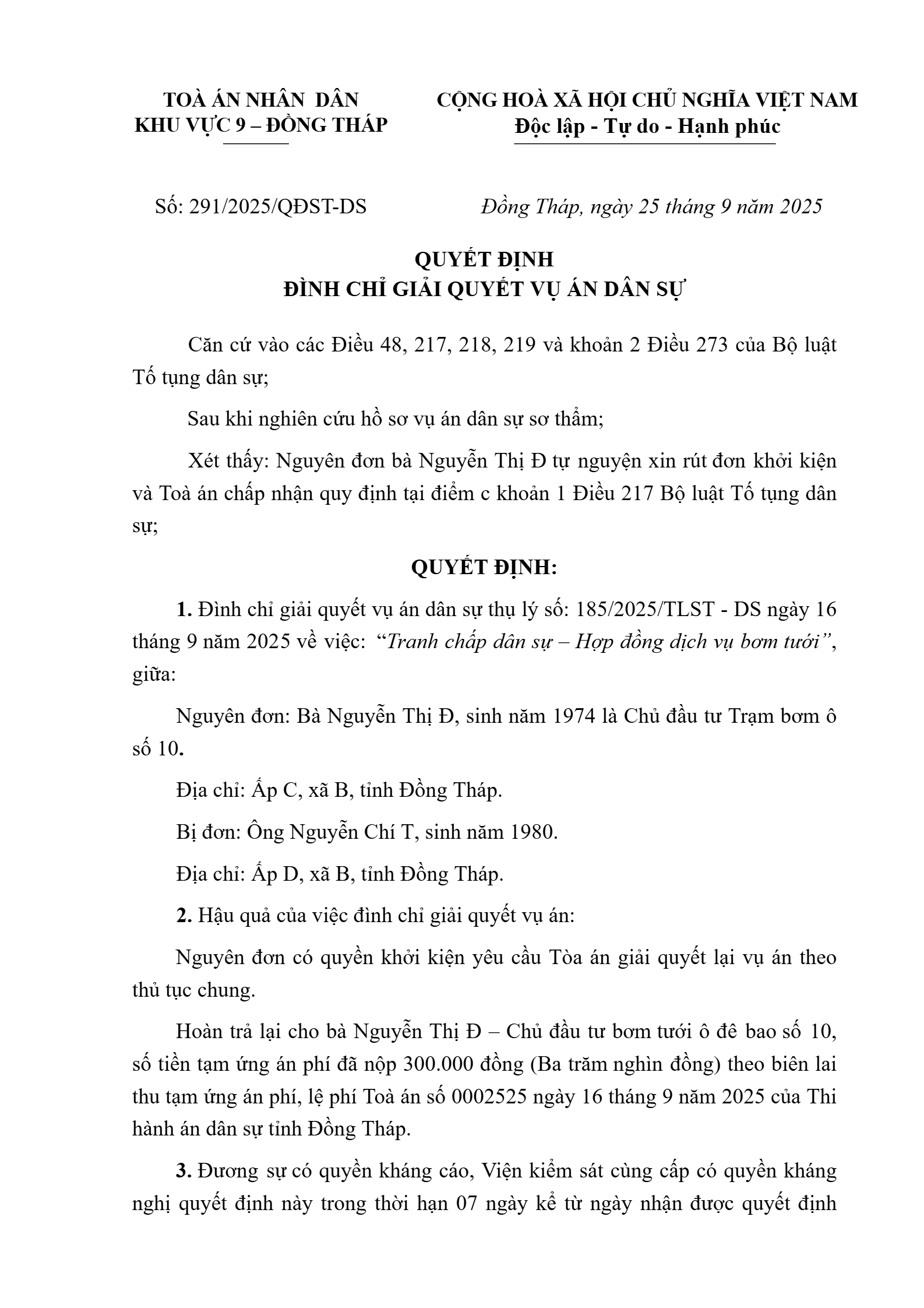 Quyết định số 291/2025/QĐST-DS ngày 25/09/2025 của Tòa án nhân dân khu vực 9 - Đồng Tháp, tỉnh Đồng Tháp về tranh chấp hợp đồng dịch vụ