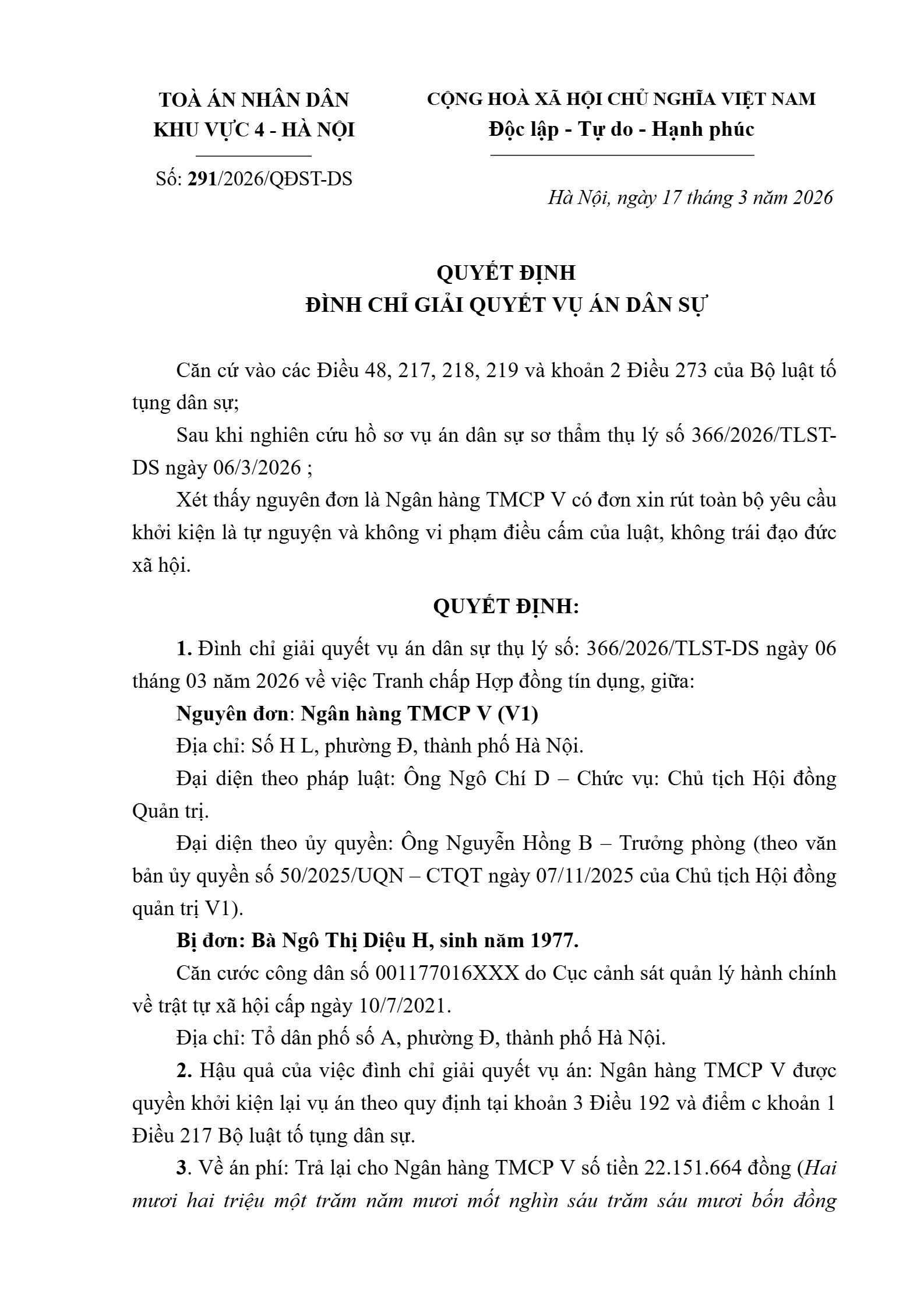 Quyết định số 291/2026/QĐST-DS ngày 17/03/2026 của Tòa án nhân dân khu vực 4 - Hà Nội, TP. Hà Nội về tranh chấp hợp đồng tín dụng