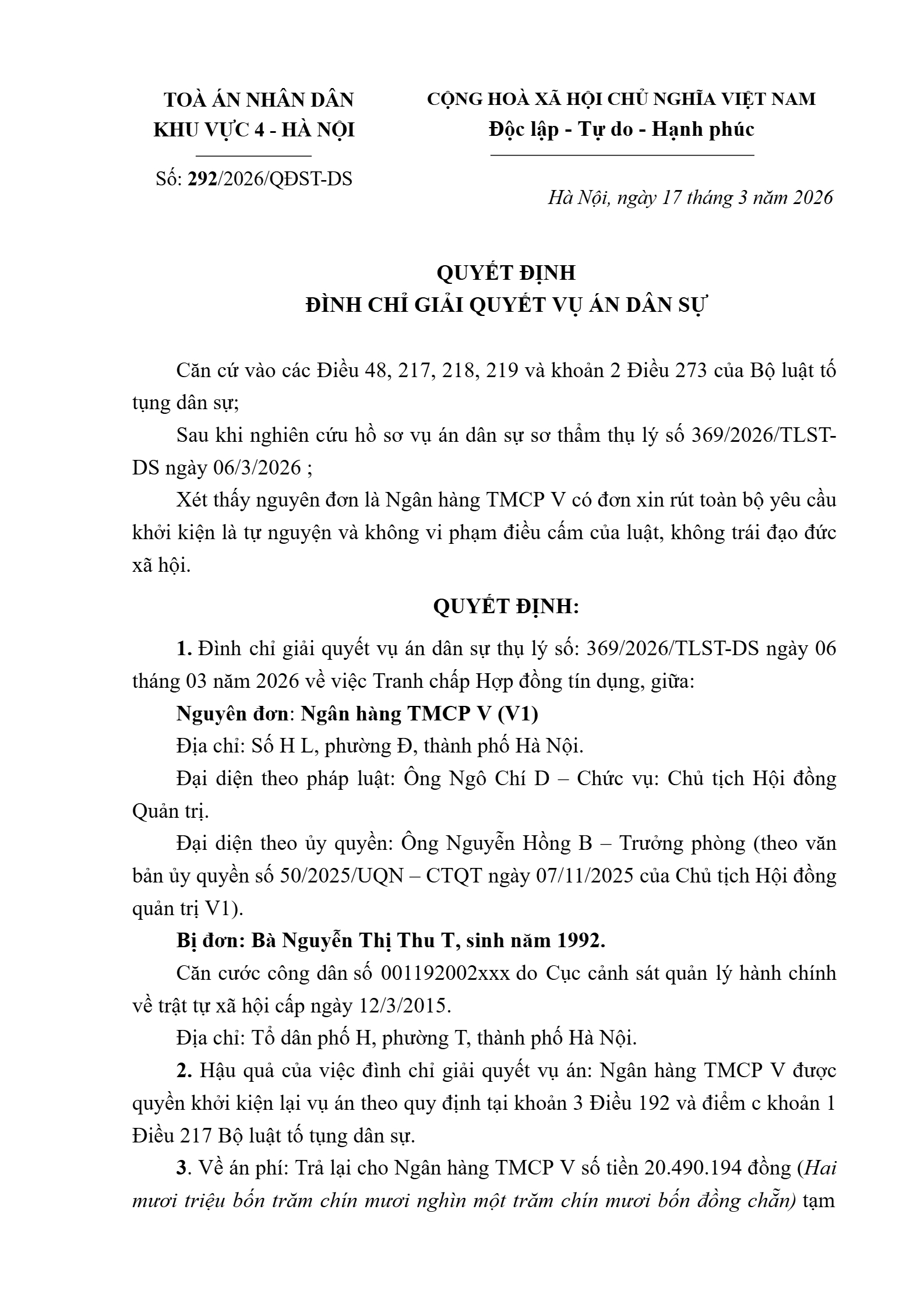 Quyết định số 292/2026/QĐST-DS ngày 17/03/2026 của Tòa án nhân dân khu vực 4 - Hà Nội, TP. Hà Nội về tranh chấp hợp đồng tín dụng