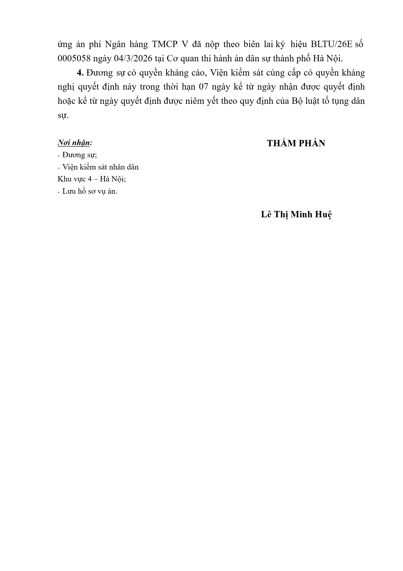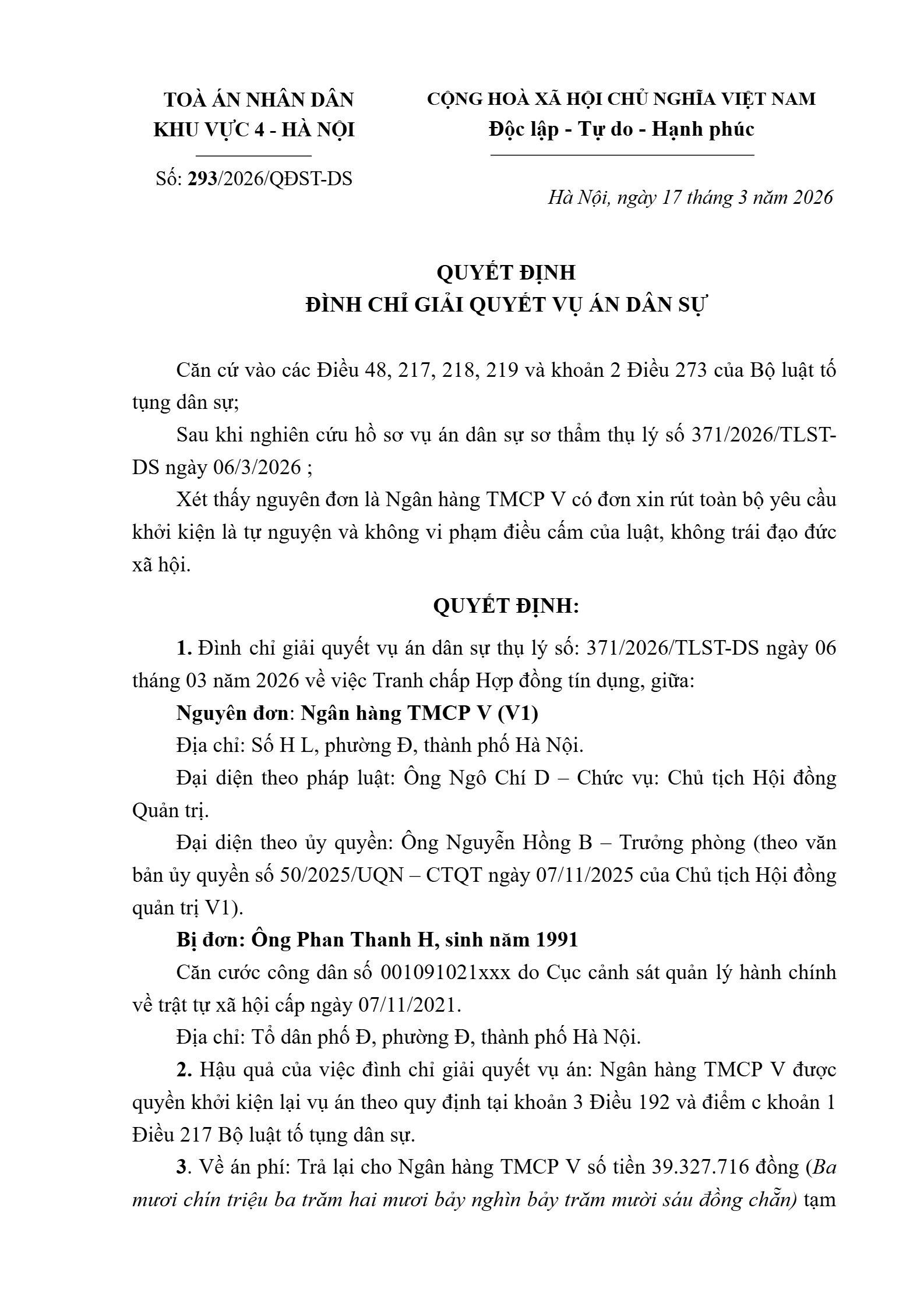 Quyết định số 293/2026/QĐST-DS ngày 17/03/2026 của Tòa án nhân dân khu vực 4 - Hà Nội, TP. Hà Nội về tranh chấp hợp đồng tín dụng
