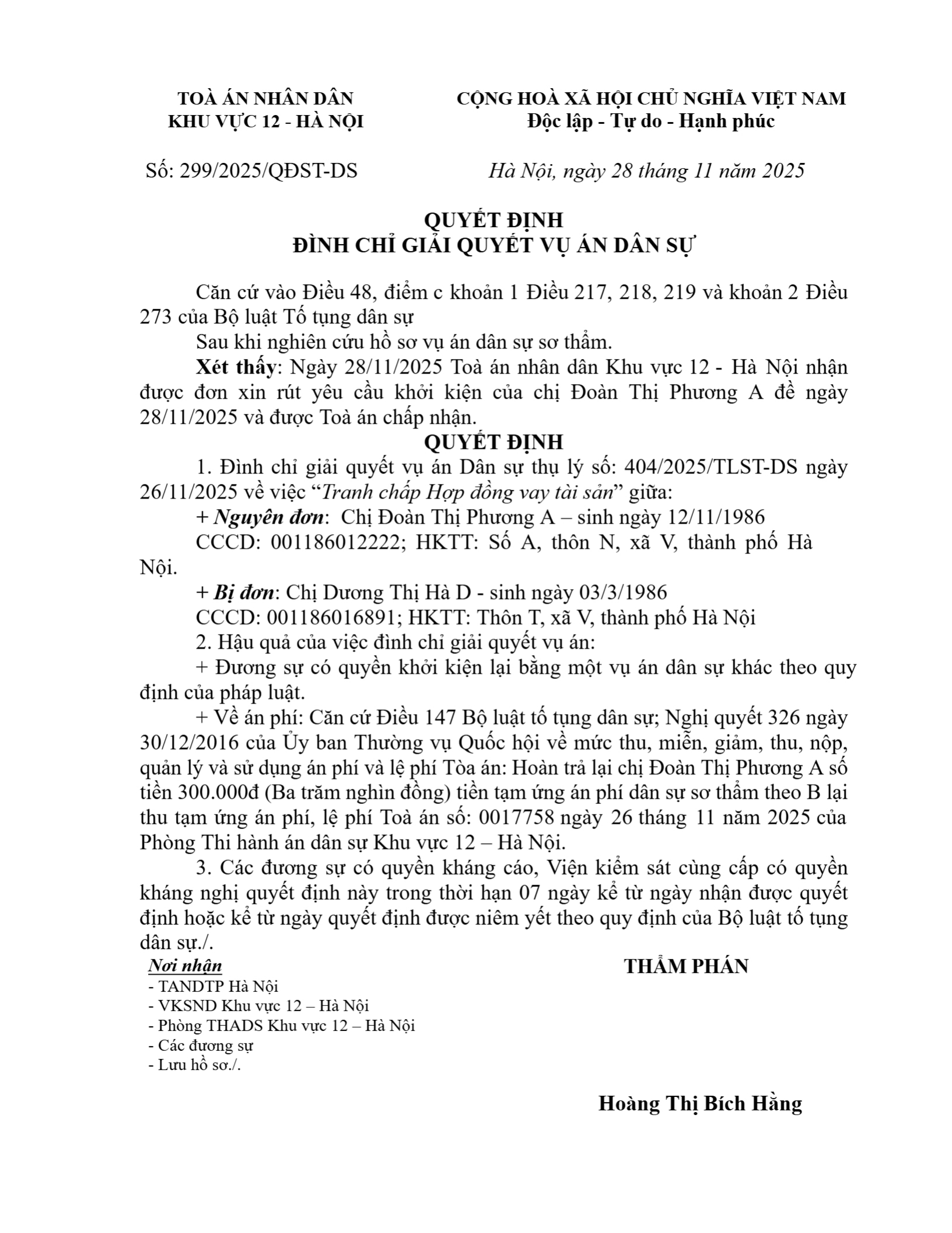 Quyết định số 299/2025/QĐST-DS ngày 28/11/2025 của Tòa án nhân dân khu vực 12 - Hà Nội, TP. Hà Nội về tranh chấp hợp đồng vay tài sản