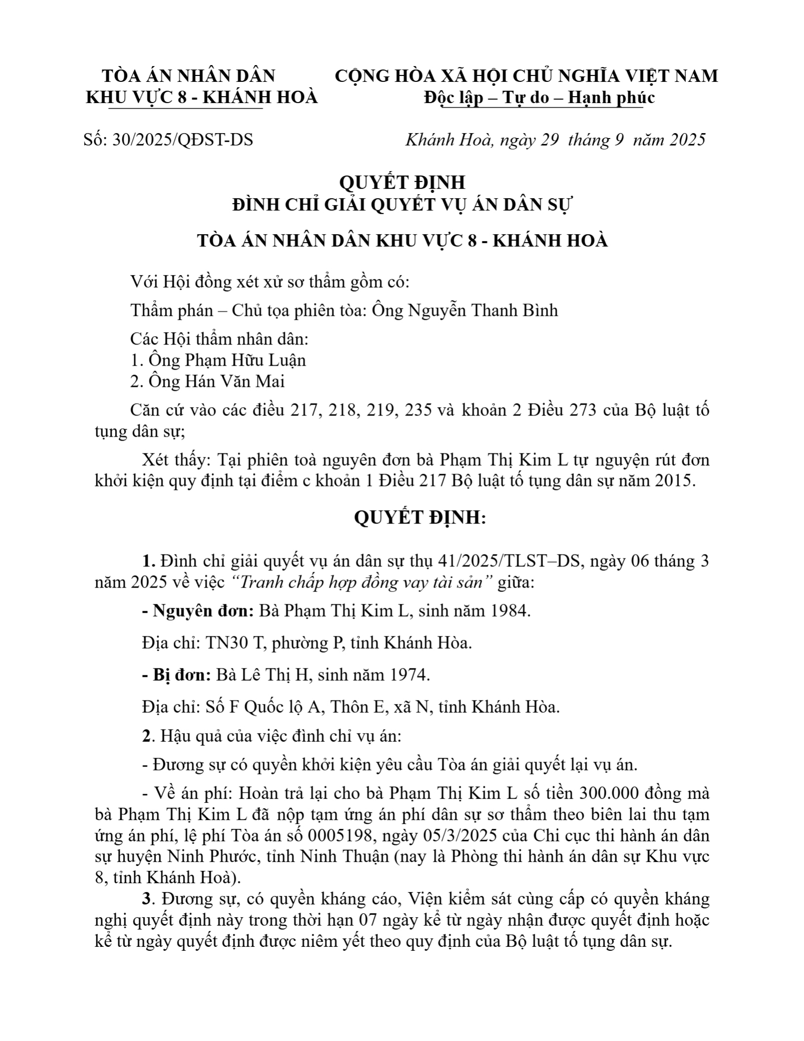Quyết định số 30/2025/QĐST-DS ngày 29/09/2025 của Tòa án nhân dân khu vực 8 - Khánh Hòa, tỉnh Khánh Hòa về tranh chấp hợp đồng vay tài sản