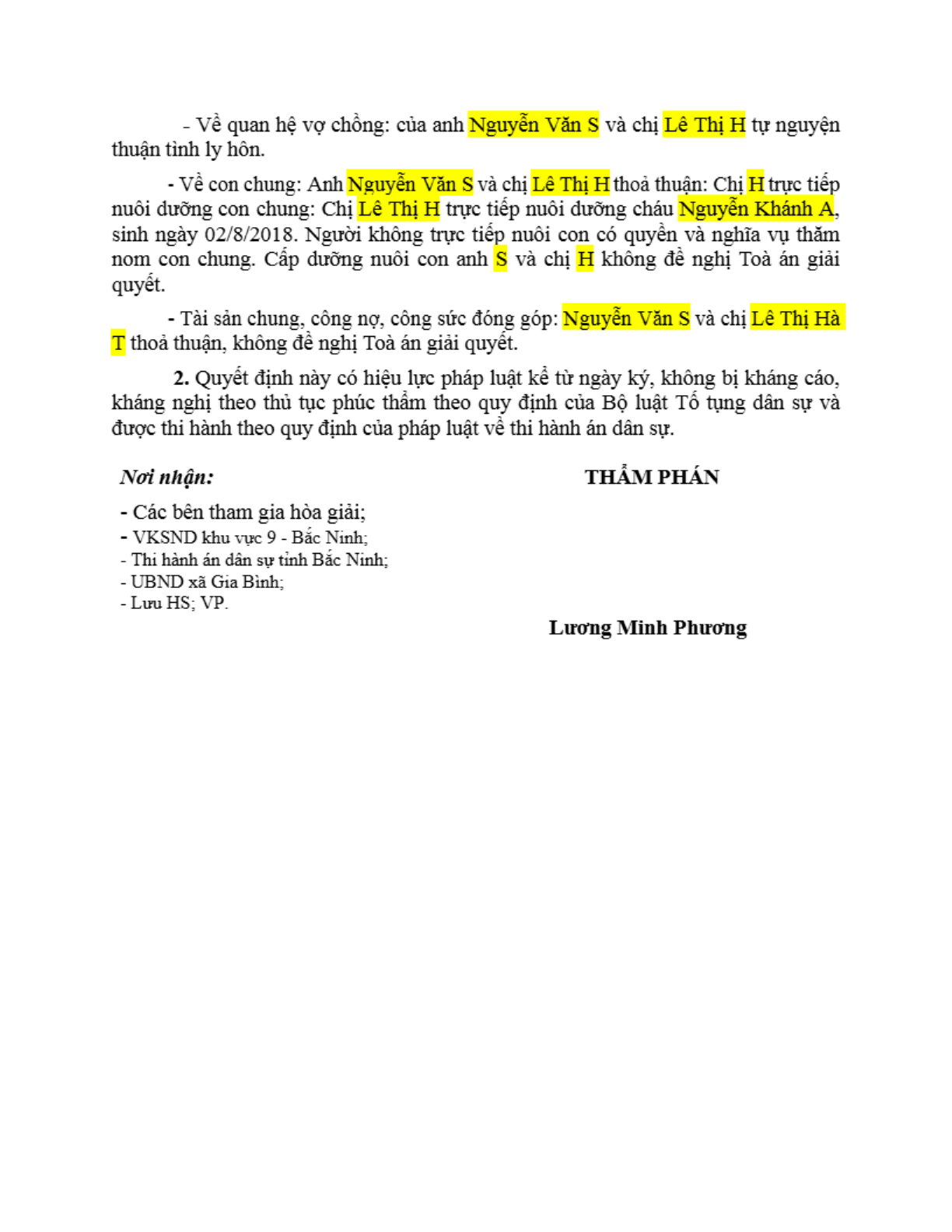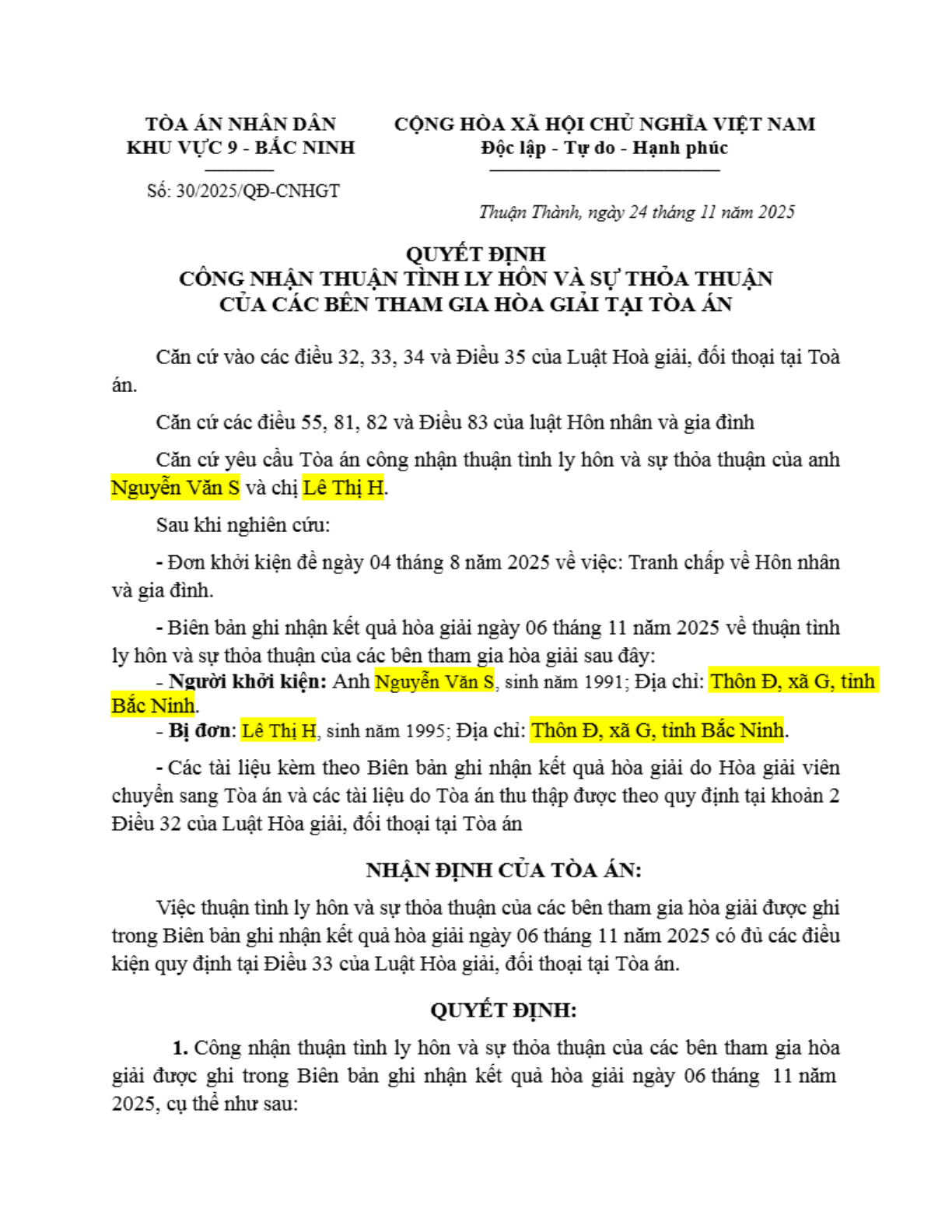 | Thông tin về vụ/việc: | Nguyễn Văn S và Lê Thị H thuận tình ly hôn |