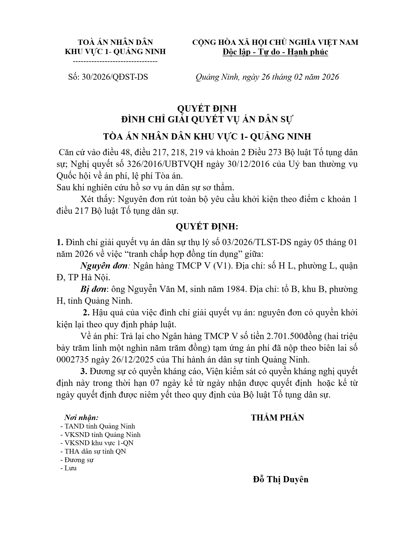Quyết định số 30/2026/QĐST-DS ngày 26/02/2026 của Tòa án nhân dân khu vực 1 - Quảng Ninh, tỉnh Quảng Ninh về tranh chấp hợp đồng tín dụng