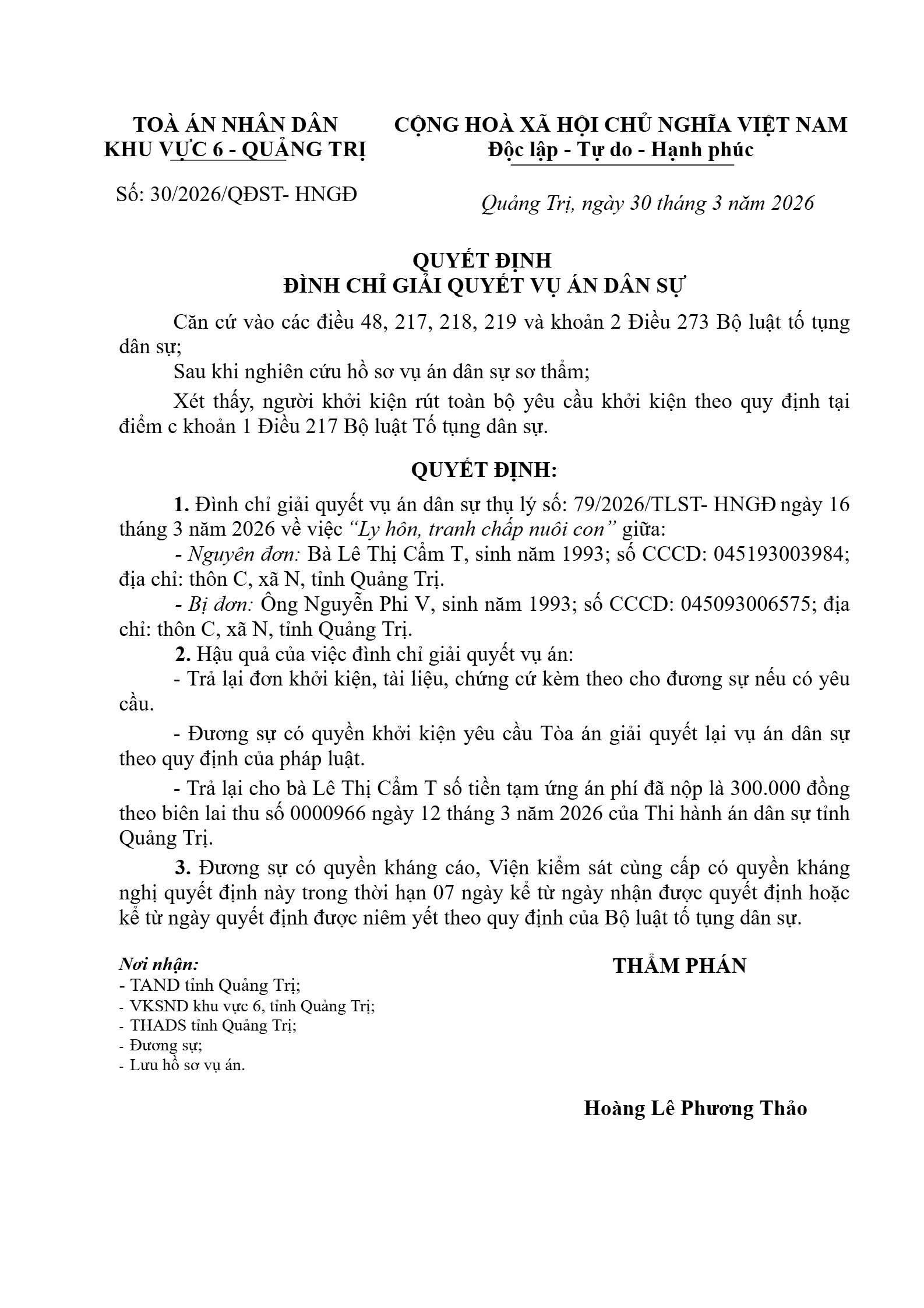 Quyết định số 30/2026/QĐST-HNGĐ ngày 30/03/2026 của Tòa án nhân dân khu vực 6 - Quảng Trị, tỉnh Quảng Trị về vụ án ly hôn về mâu thuẫn gia đình