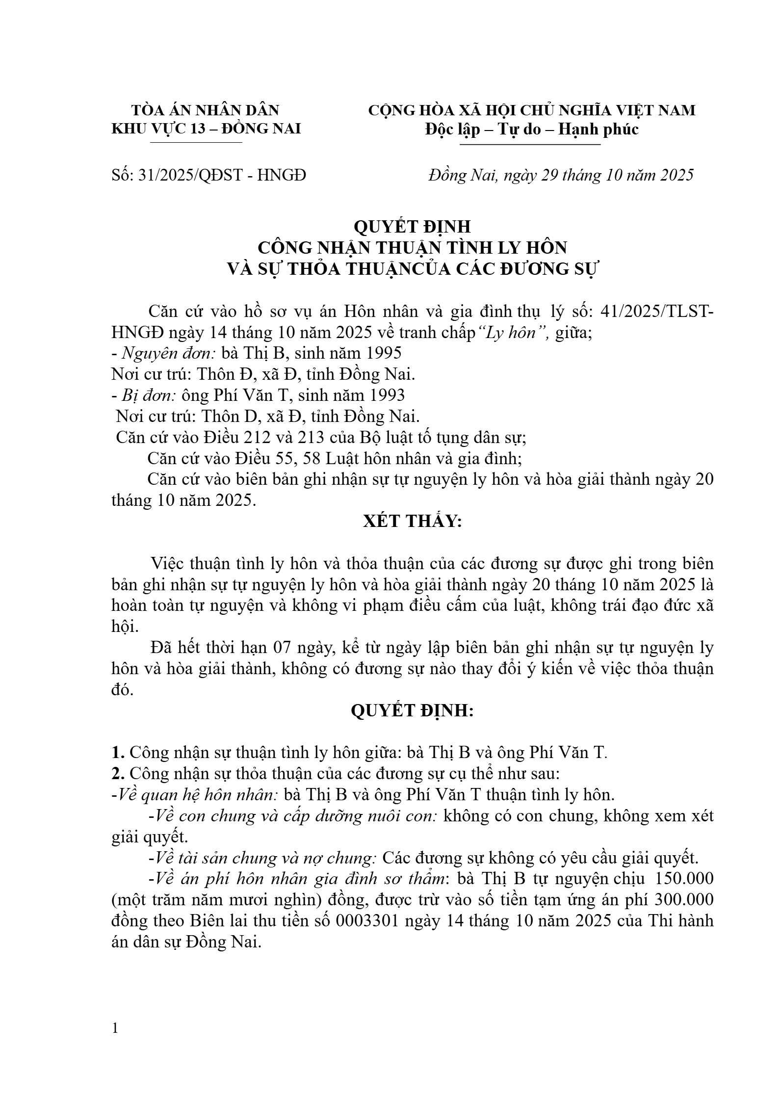 Quyết định số 31/2025/QĐST ngày 29/10/2025 của Tòa án nhân dân khu vực 13 - Đồng Nai, tỉnh Đồng Nai về vụ án ly hôn về mâu thuẫn gia đình