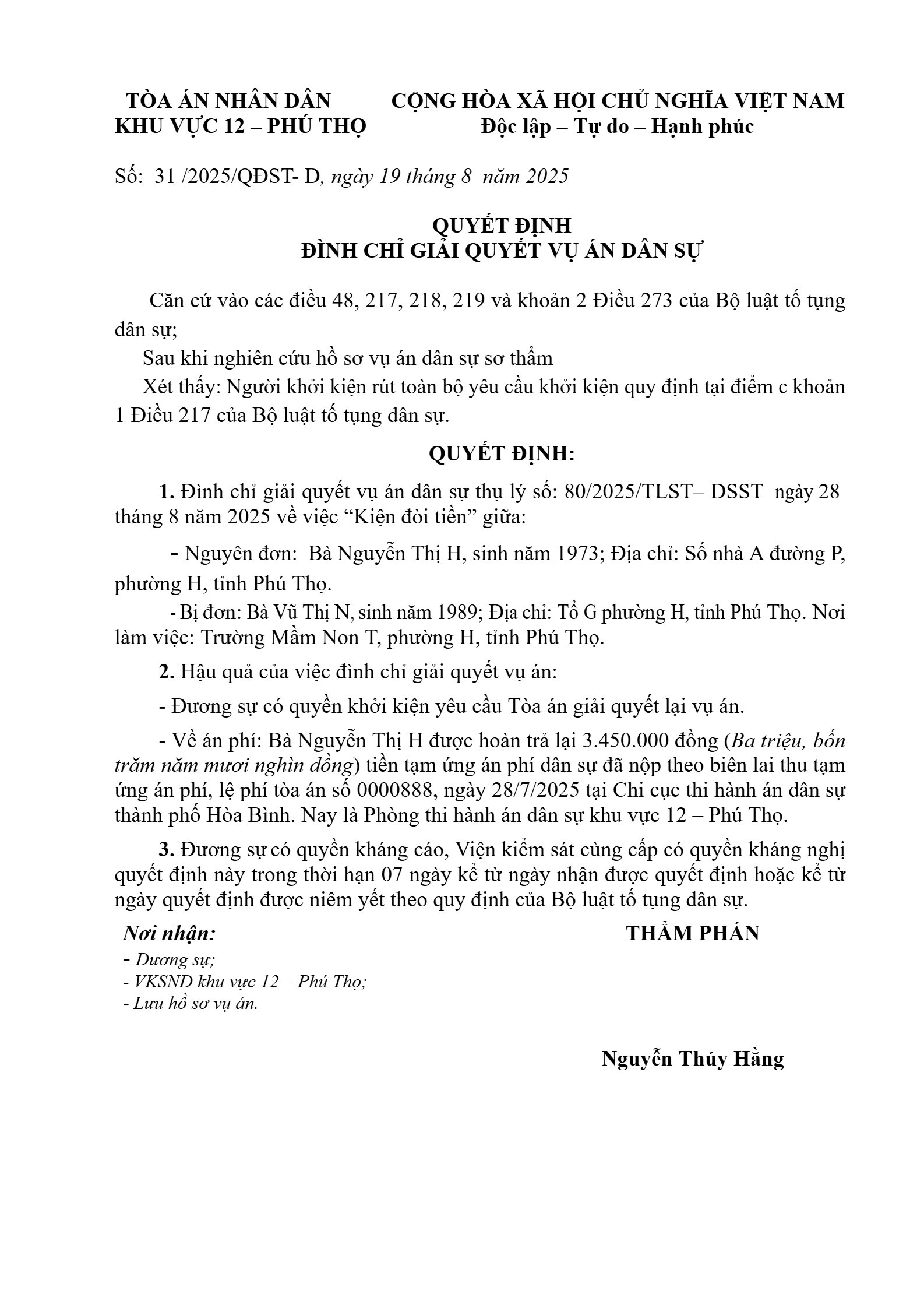 Quyết định số 31/2025/QĐST-DS ngày 19/08/2025 của TAND TP. Hòa Bình, tỉnh Hòa Bình về tranh chấp hợp đồng vay tài sản