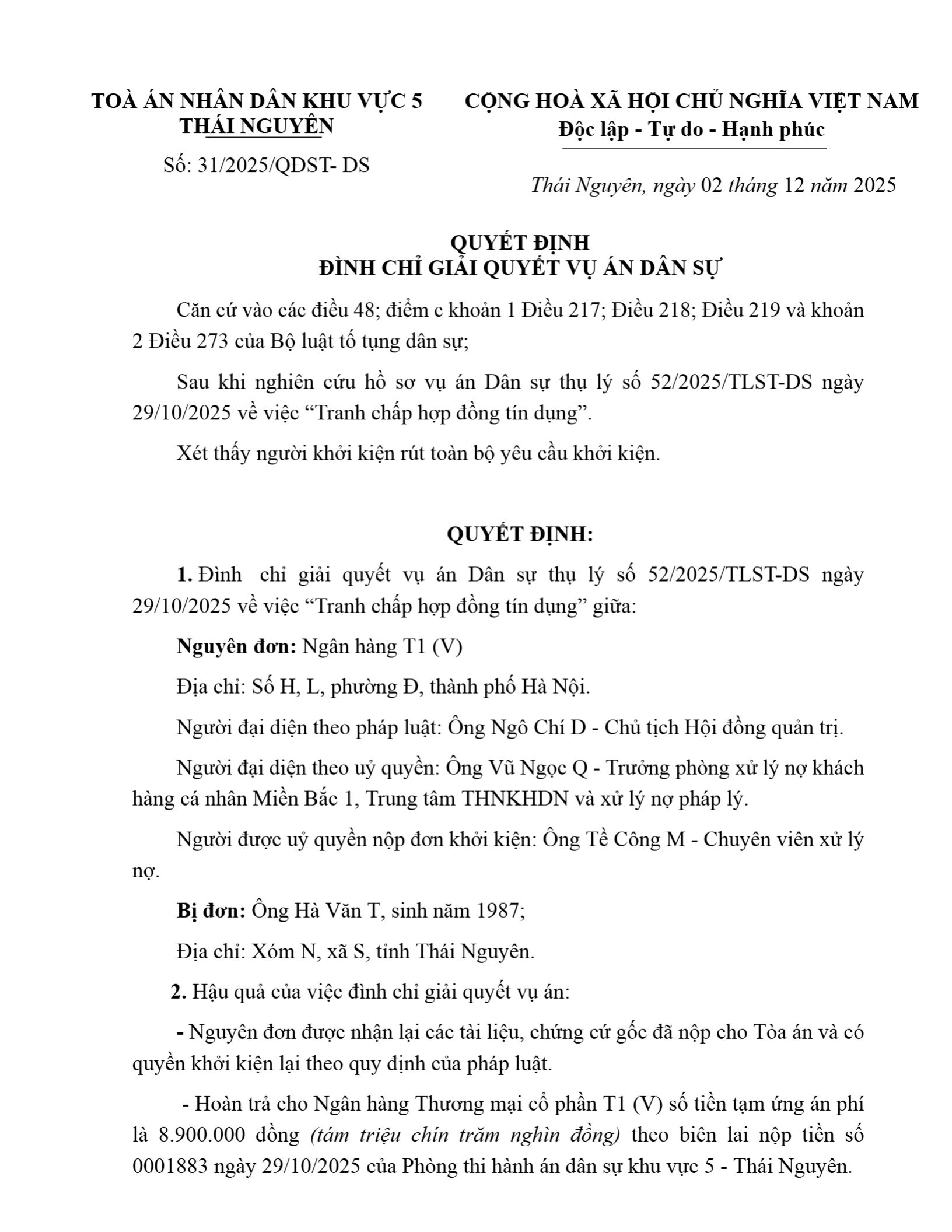 Quyết định số 31/2025/QĐST-DS ngày 02/12/2025 của Tòa án nhân dân khu vực 5 - Thái Nguyên, tỉnh Thái Nguyên về tranh chấp hợp đồng tín dụng