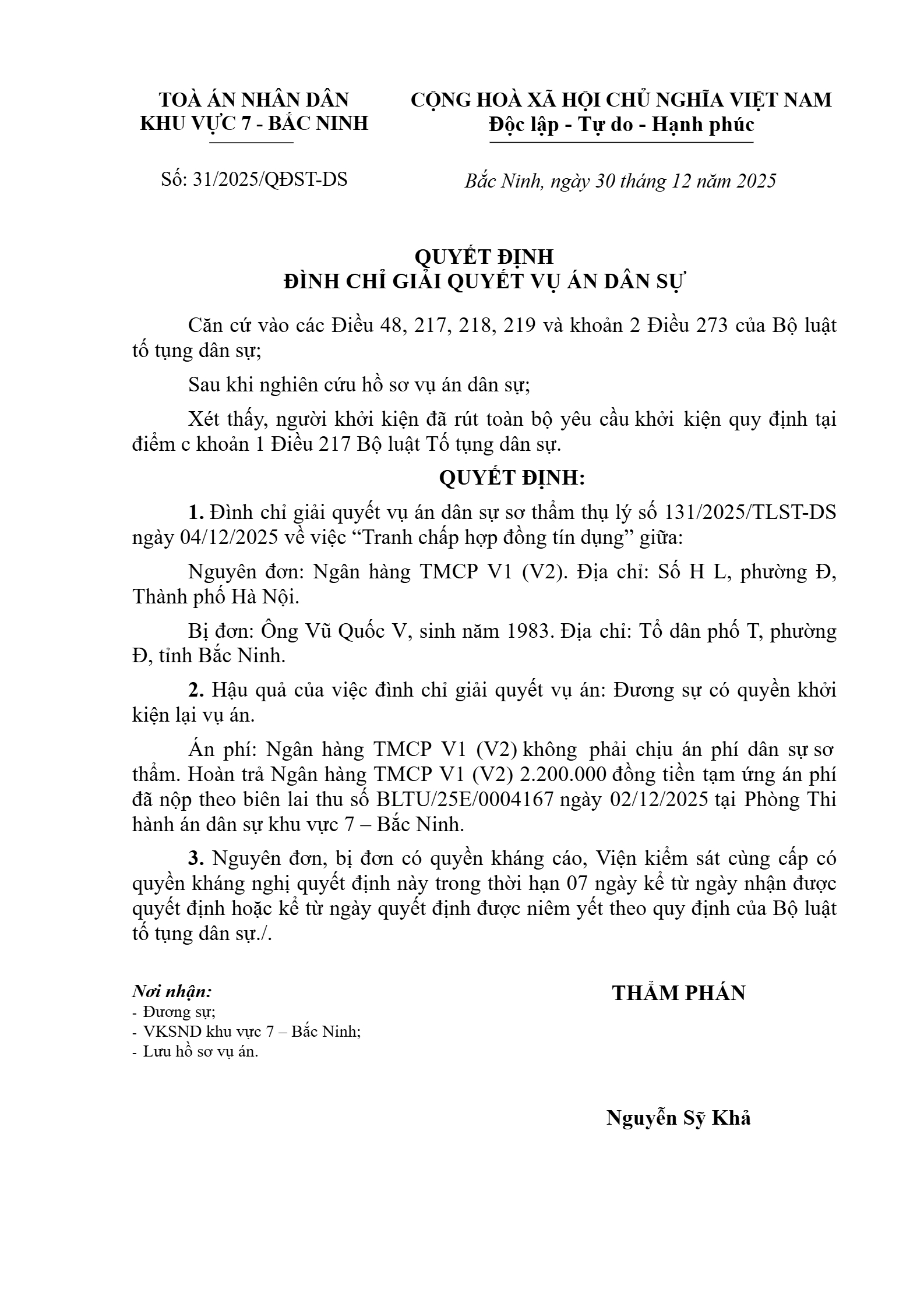Quyết định số 31/2025/QĐST-DS ngày 30/12/2025 của Tòa án nhân dân khu vực 7 - Bắc Ninh, tỉnh Bắc Ninh về tranh chấp hợp đồng tín dụng