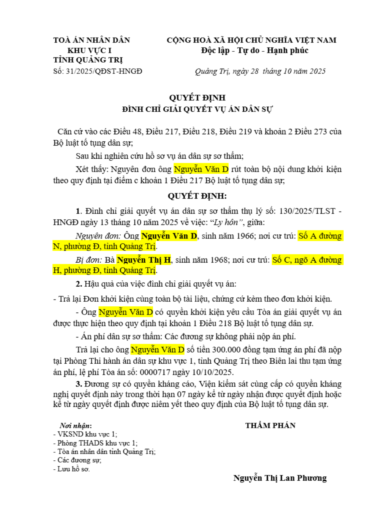 Quyết định số 31/2025/QĐST-HNGĐ ngày 28/10/2025 của Tòa án nhân dân khu vực 1 - Quảng Trị, tỉnh Quảng Trị về vụ án ly hôn về mâu thuẫn gia đình