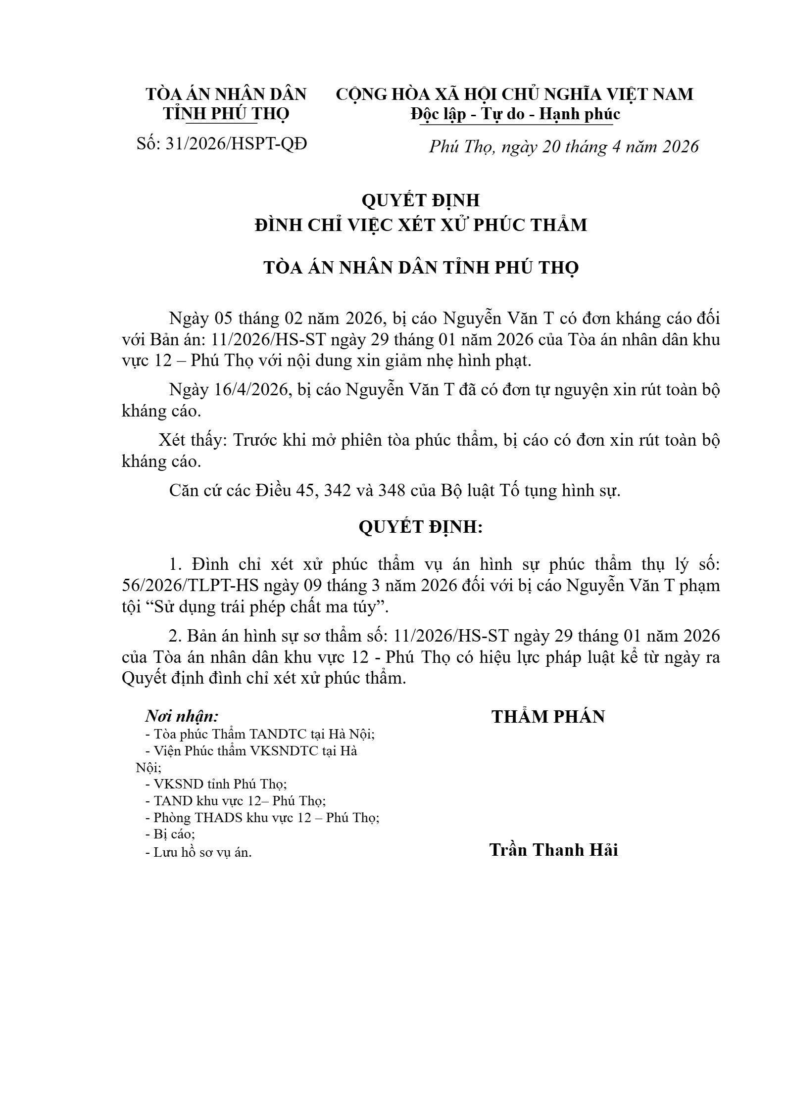 Quyết định số 31/2026/QĐPT-HS ngày 20/04/2026 của TAND tỉnh Phú Thọ