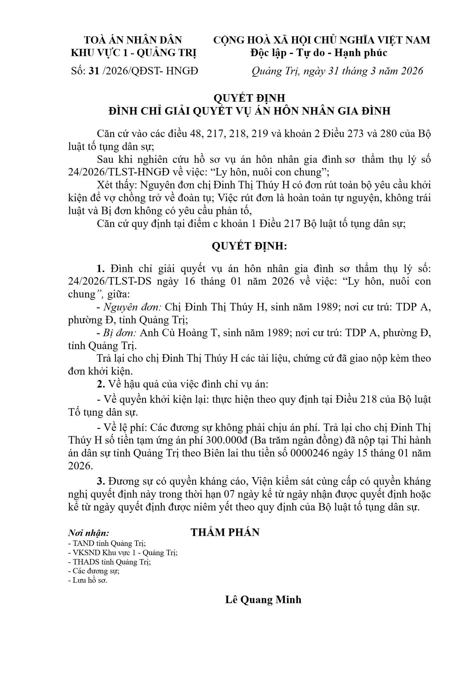 Quyết định số 31/2026/QĐST-HNGĐ ngày 31/03/2026 của Tòa án nhân dân khu vực 1 - Quảng Trị, tỉnh Quảng Trị về vụ án ly hôn về mâu thuẫn gia đình