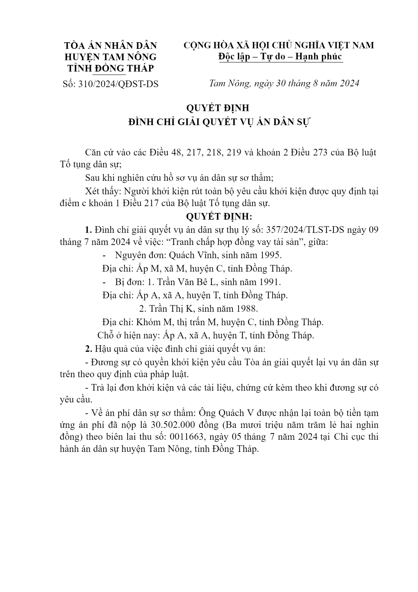 Quyết định số 310/2024/QĐST-DS ngày 30/08/2024 của TAND huyện Tam Nông, tỉnh Đồng Tháp về tranh chấp hợp đồng vay tài sản