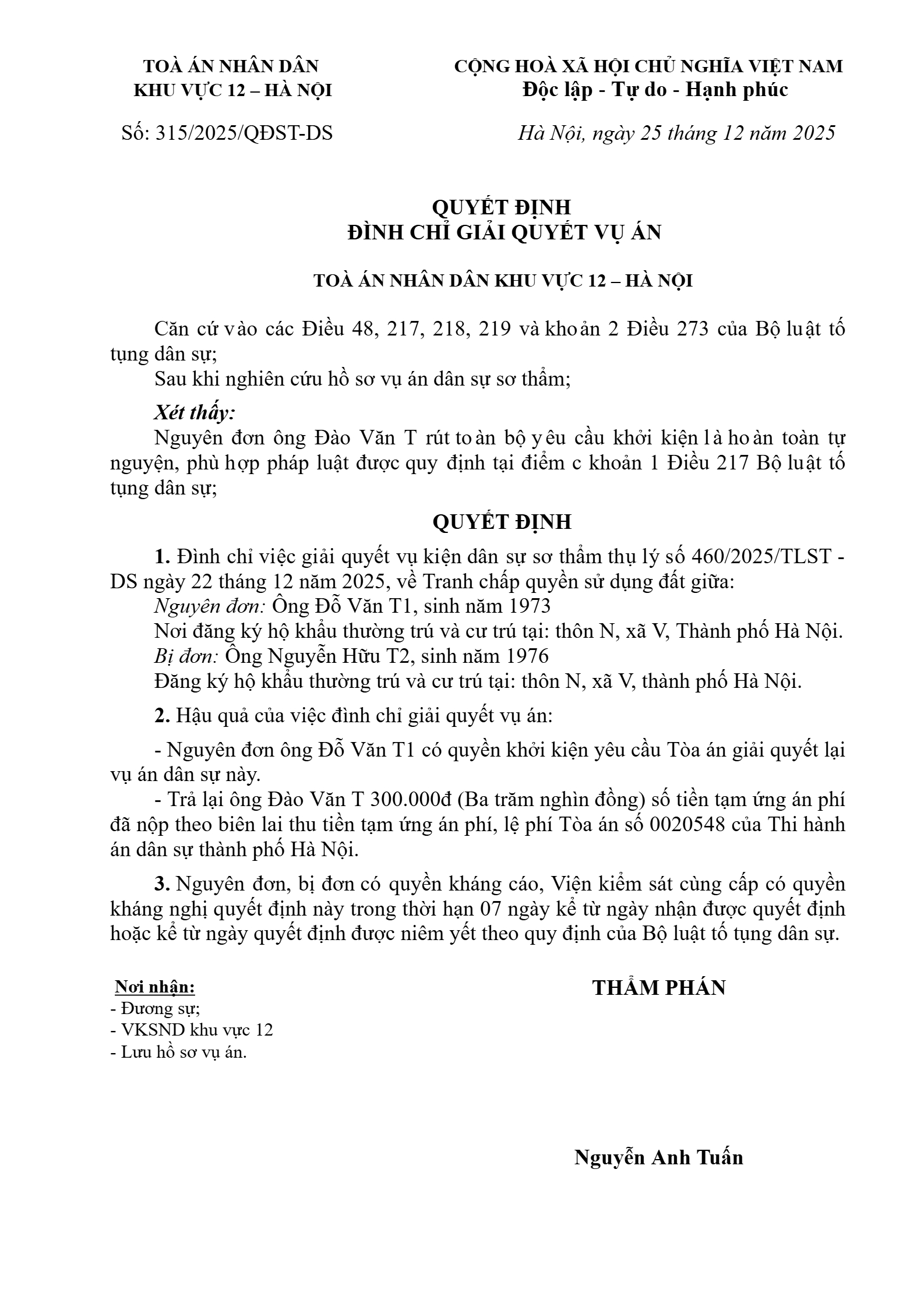 Quyết định số 315/2025/QĐST-DS ngày 25/12/2025 của Tòa án nhân dân khu vực 12 - Hà Nội, TP. Hà Nội về tranh chấp quyền sử dụng đất
