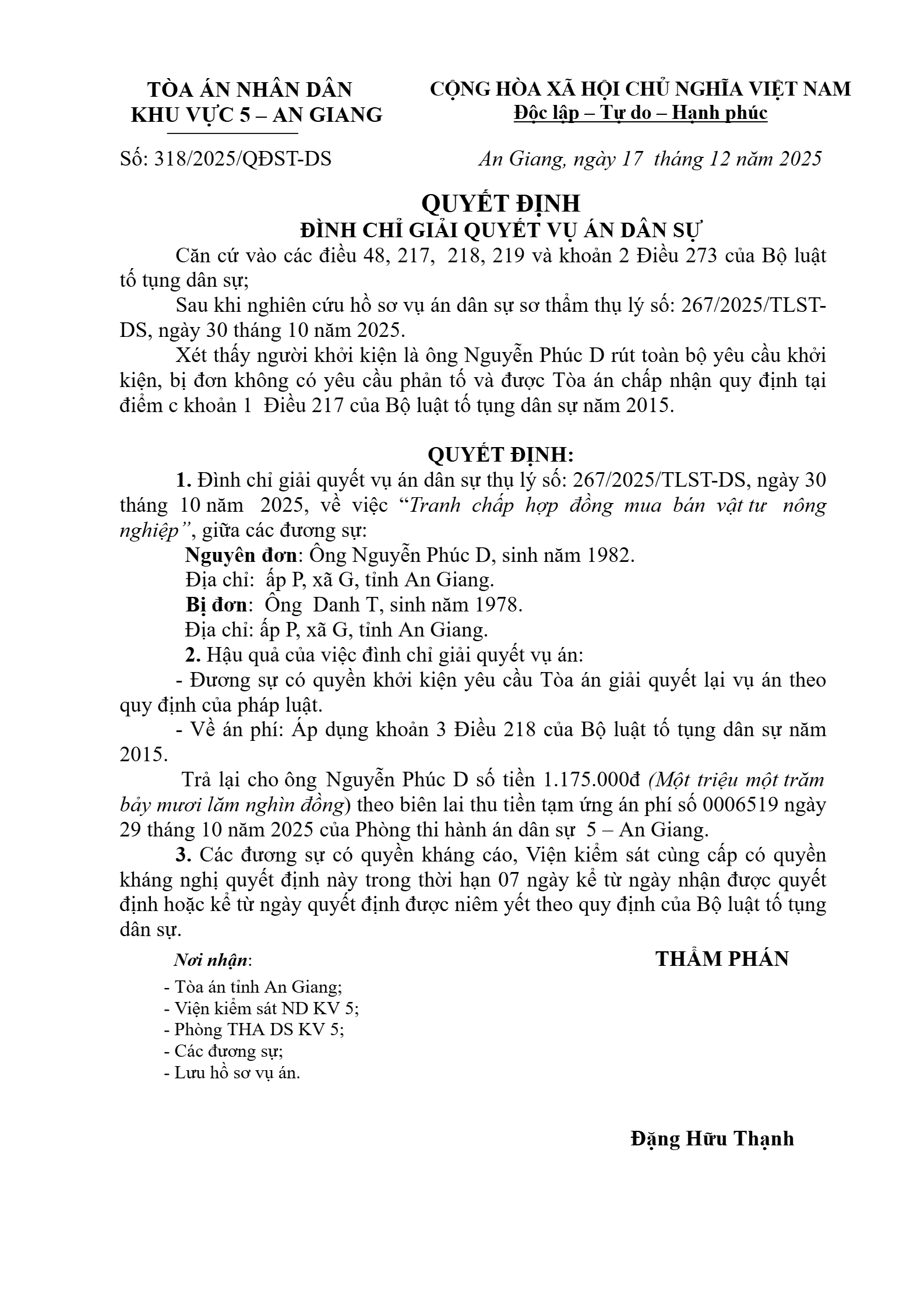 Quyết định số 318/2025/QĐST-DS ngày 17/12/2025 của Tòa án nhân dân khu vực 5 - An Giang, tỉnh An Giang về tranh chấp hợp đồng vay tài sản