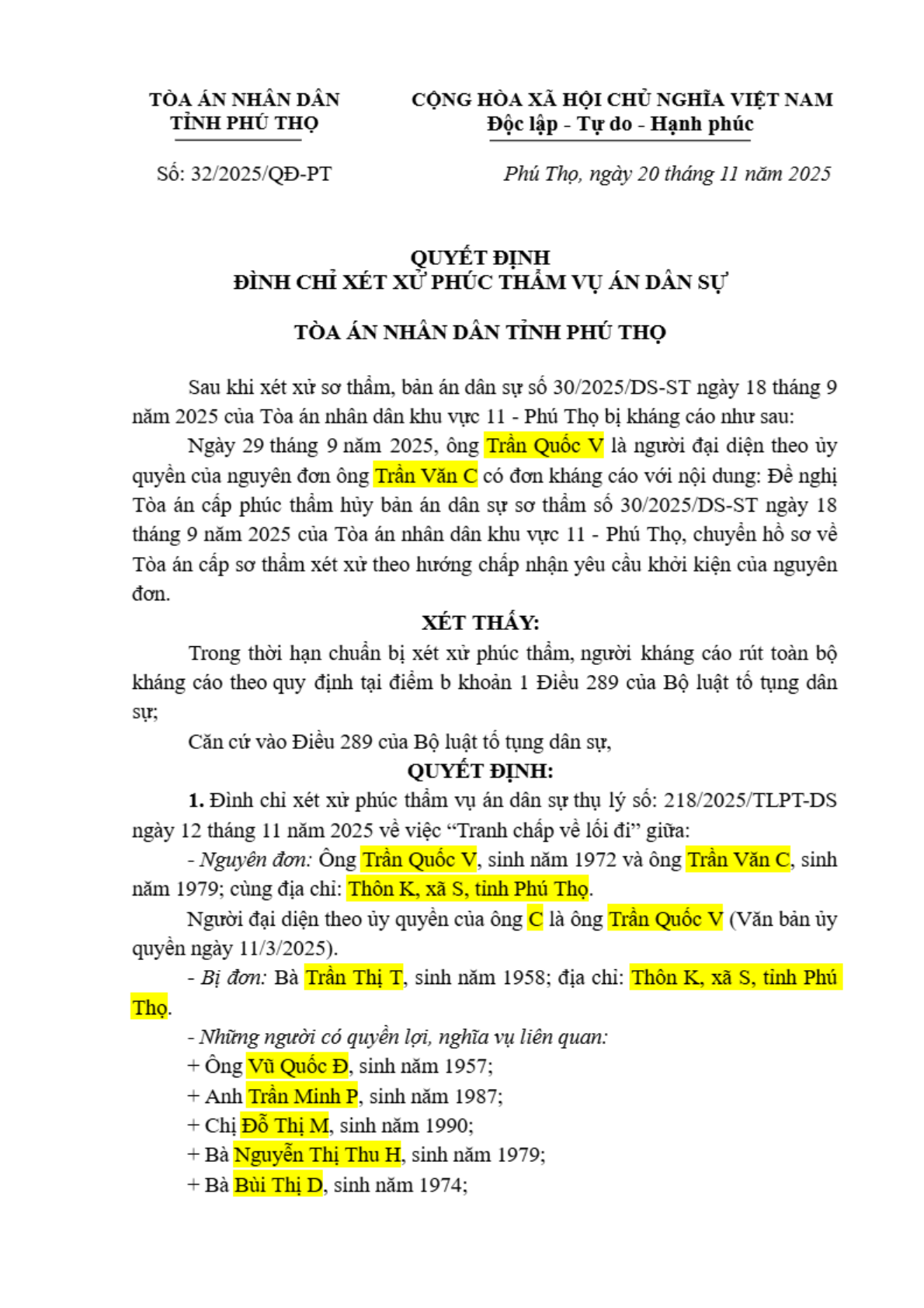 Quyết định số 32/2025/QĐPT-DS ngày 20/11/2025 của TAND tỉnh Phú Thọ về tranh chấp quyền sử dụng đất