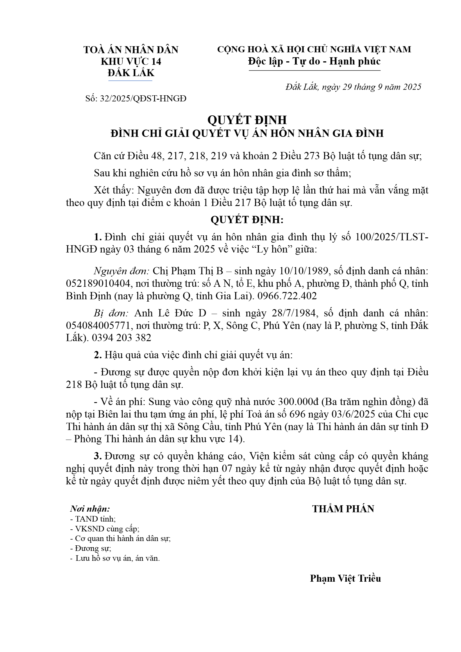 Quyết định số 32/2025/QĐST-HNGĐ ngày 29/09/2025 của Tòa án nhân dân khu vực 14 - Đắk Lắk, tỉnh Đắk Lắk về vụ án ly hôn về mâu thuẫn gia đình