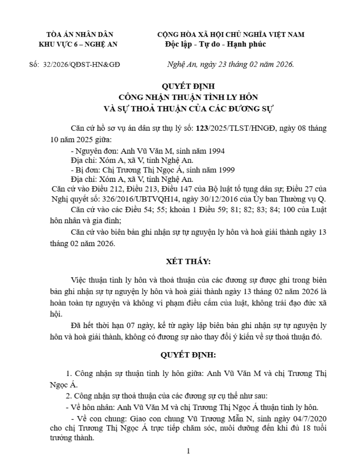 Quyết định số 32/2026/HNGĐ-ST ngày 23/02/2026 của Tòa án nhân dân khu vực 6 - Nghệ An, tỉnh Nghệ An về vụ án ly hôn về mâu thuẫn gia đình