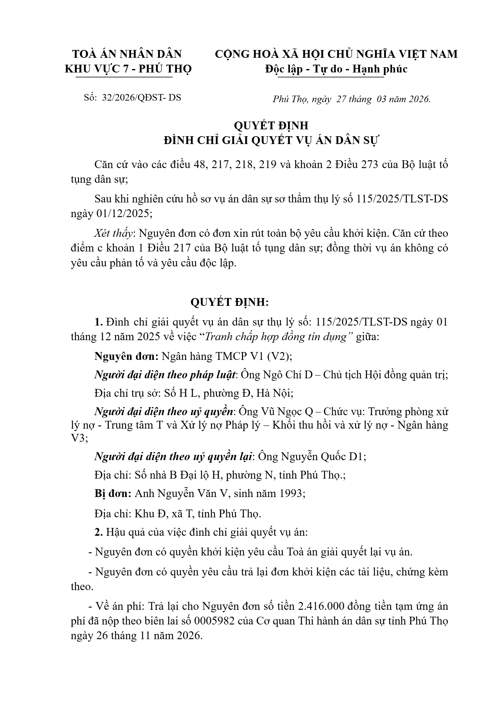 Quyết định số 32/2026/QĐST-DS ngày 27/03/2026 của Tòa án nhân dân khu vực 7 - Phú Thọ, tỉnh Phú Thọ về tranh chấp hợp đồng tín dụng