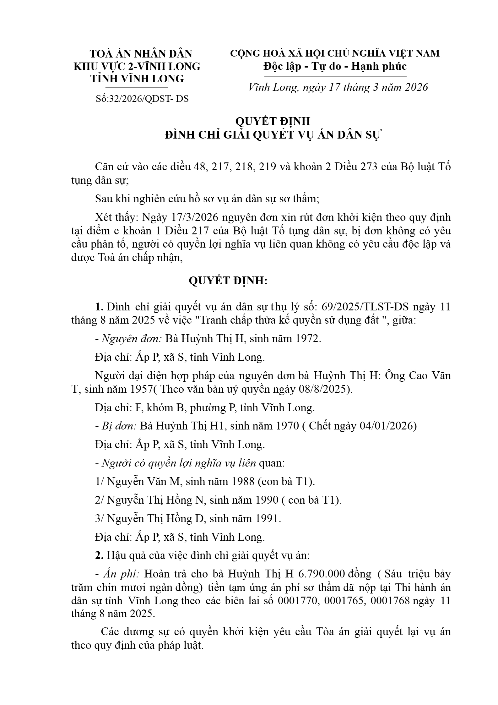 Quyết định số 32/2026/QĐST-DS ngày 17/03/2026 của Tòa án nhân dân khu vực 2 - Vĩnh Long, tỉnh Vĩnh Long về tranh chấp đất đai đối với đất nông nghiệp để trồng cây hàng năm, nuôi trồng thủy sản