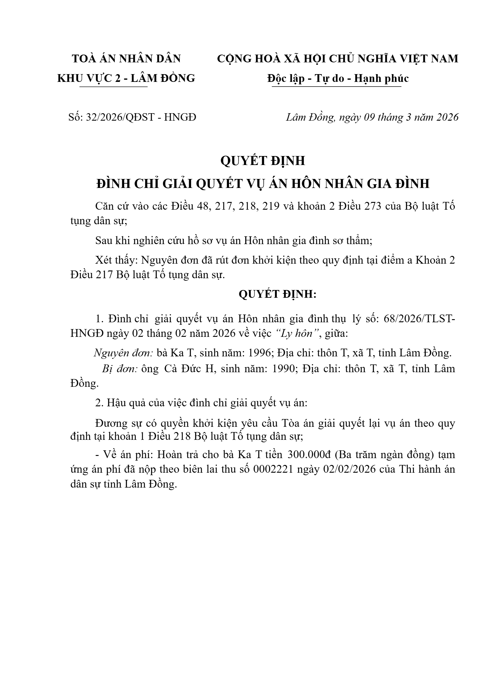 Quyết định số 32/2026/QĐST-HNGĐ ngày 09/03/2026 của Tòa án nhân dân khu vực 2 - Lâm Đồng, tỉnh Lâm Đồng về vụ án ly hôn về mâu thuẫn gia đình