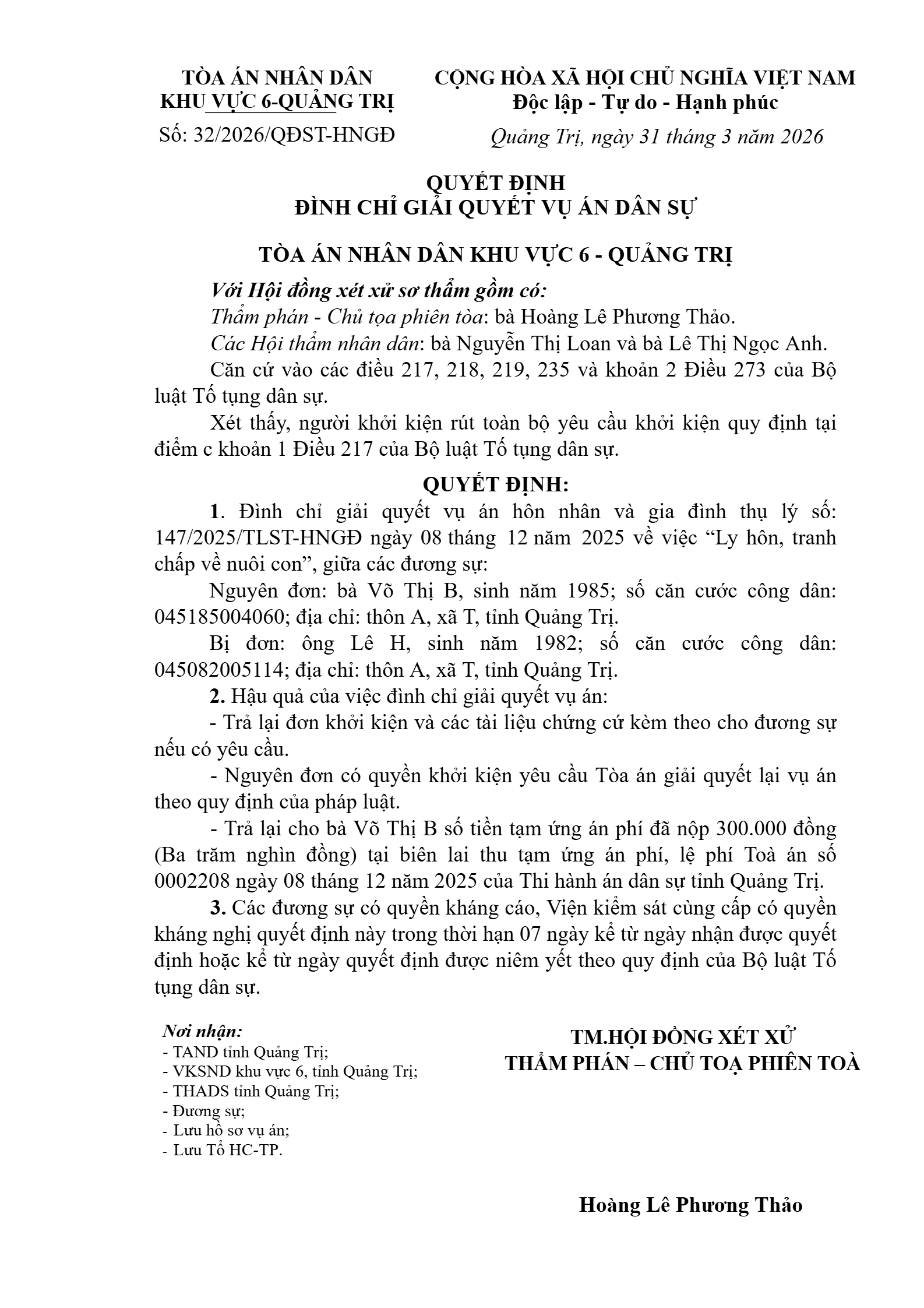 Quyết định số 32/2026/QĐST-HNGĐ ngày 31/03/2026 của Tòa án nhân dân khu vực 6 - Quảng Trị, tỉnh Quảng Trị về vụ án ly hôn về mâu thuẫn gia đình