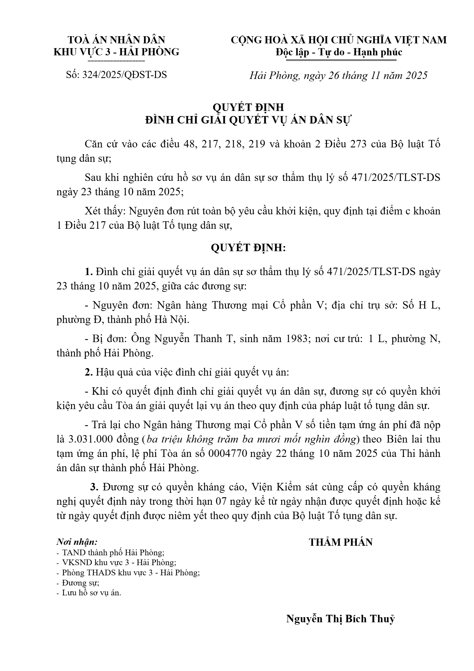 Quyết định số 324/2025/QĐST-DS ngày 26/11/2025 của Tòa án nhân dân khu vực 3 - Hải Phòng, TP. Hải Phòng về tranh chấp hợp đồng tín dụng