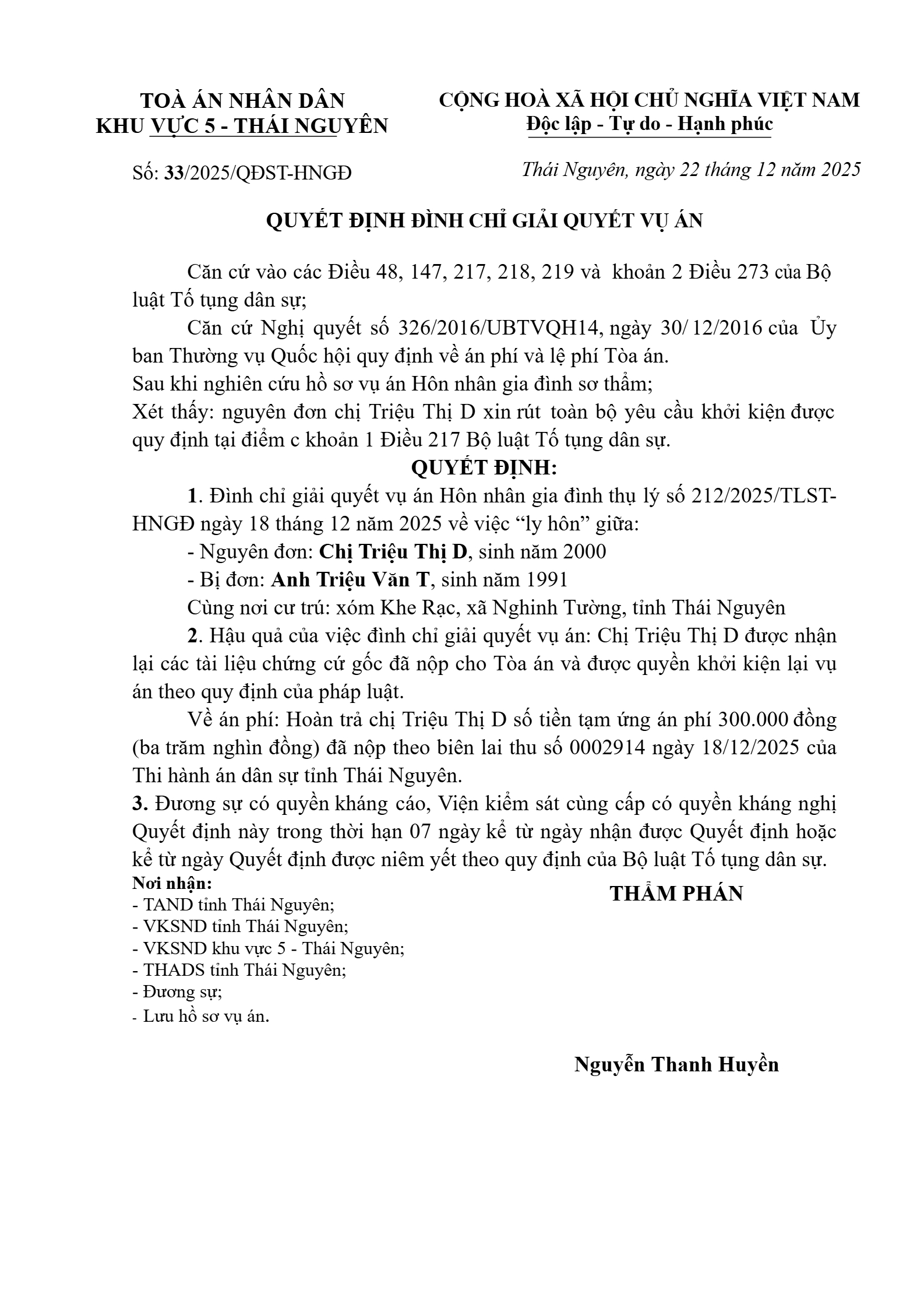 Quyết định số 33/2025/QĐST-HNGĐ ngày 22/12/2025 của Tòa án nhân dân khu vực 5 - Thái Nguyên, tỉnh Thái Nguyên về vụ án ly hôn về mâu thuẫn gia đình
