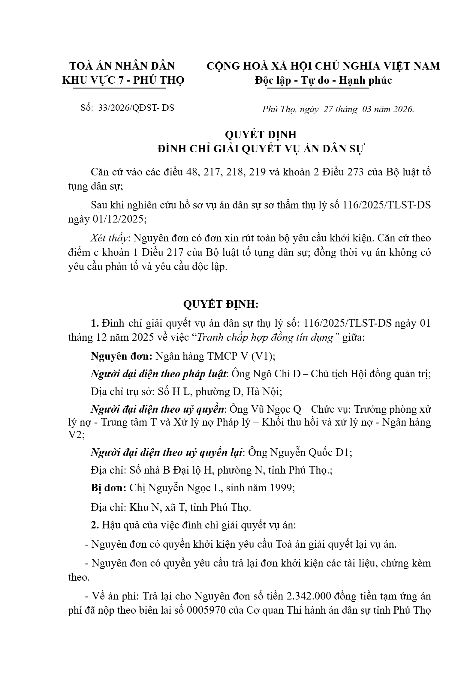 Quyết định số 33/2026/QĐST-DS ngày 27/03/2026 của Tòa án nhân dân khu vực 7 - Phú Thọ, tỉnh Phú Thọ về tranh chấp hợp đồng tín dụng