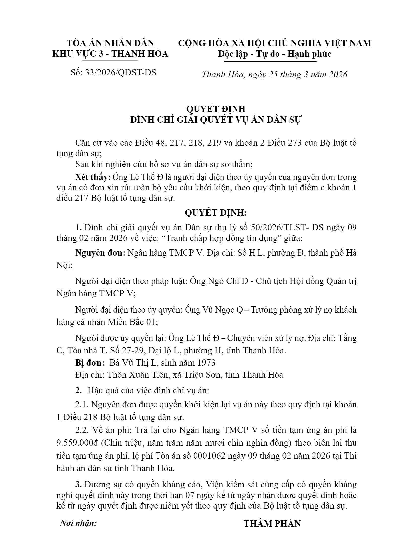 Quyết định số 33/2026/QĐST-DS ngày 25/03/2026 của Tòa án nhân dân khu vực 3 - Thanh Hóa, tỉnh Thanh Hóa về tranh chấp hợp đồng tín dụng