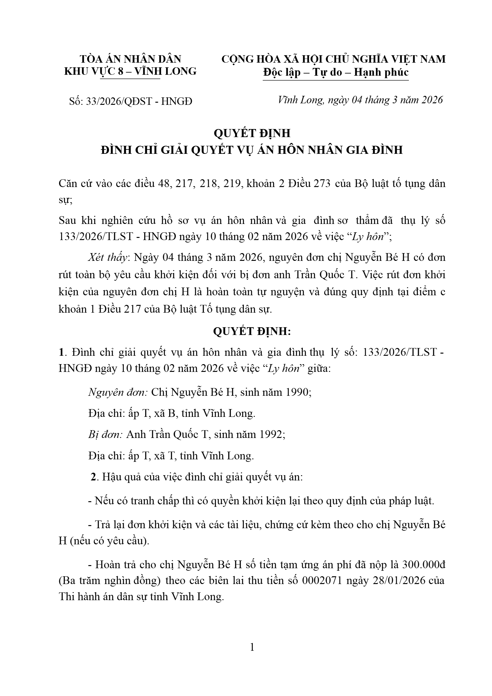 Quyết định số 33/2026/QĐST-HNGĐ ngày 04/03/2026 của Tòa án nhân dân khu vực 8 - Vĩnh Long, tỉnh Vĩnh Long về vụ án ly hôn về mâu thuẫn gia đình