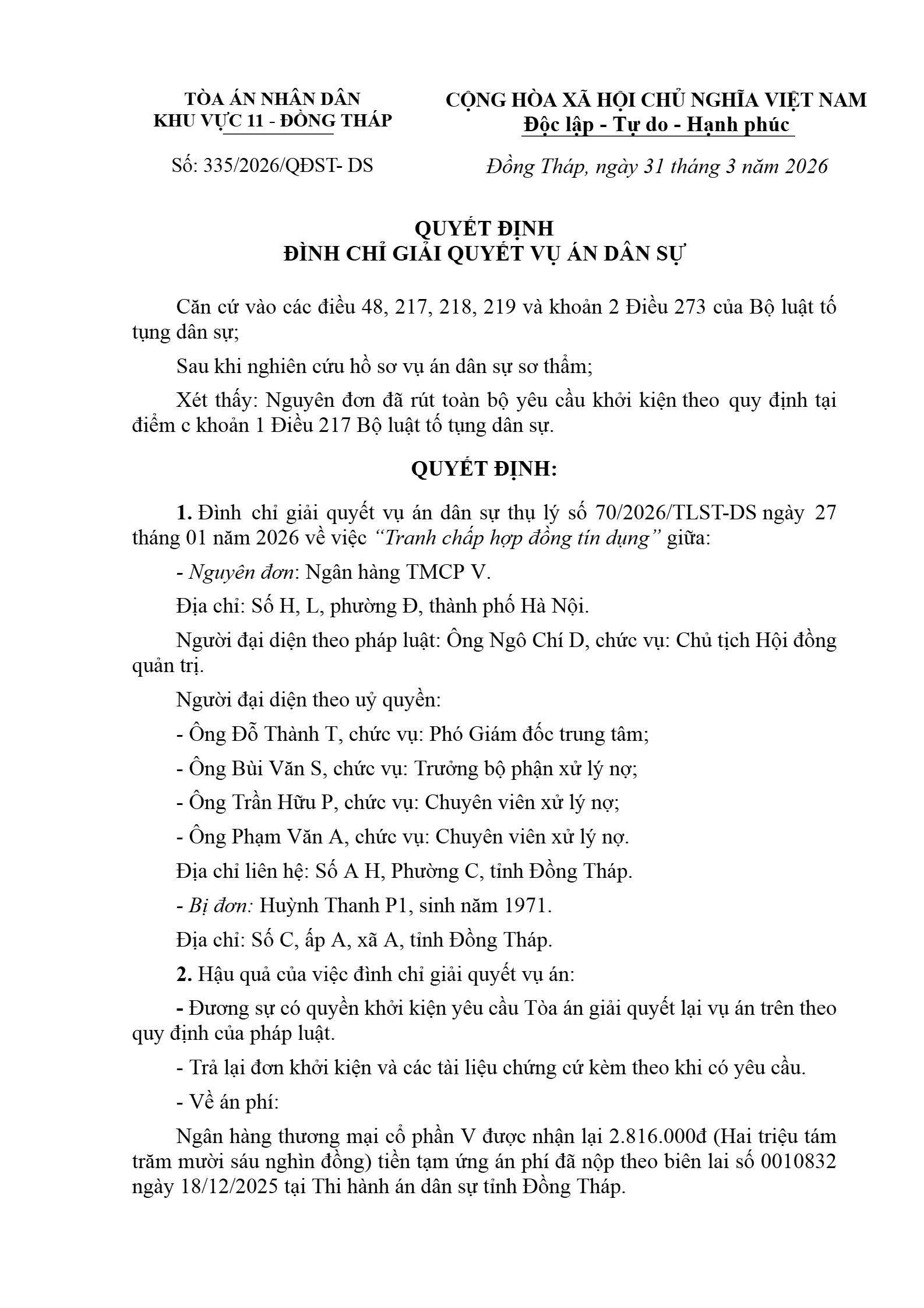 | Tên Quyết định: | Quyết định số 335/2026/QĐST-DS ngày 31/03/2026 của Tòa án nhân dân khu vực 11 - Đồng Tháp, tỉnh Đồng Tháp về tranh chấp hợp đồng tín dụng |