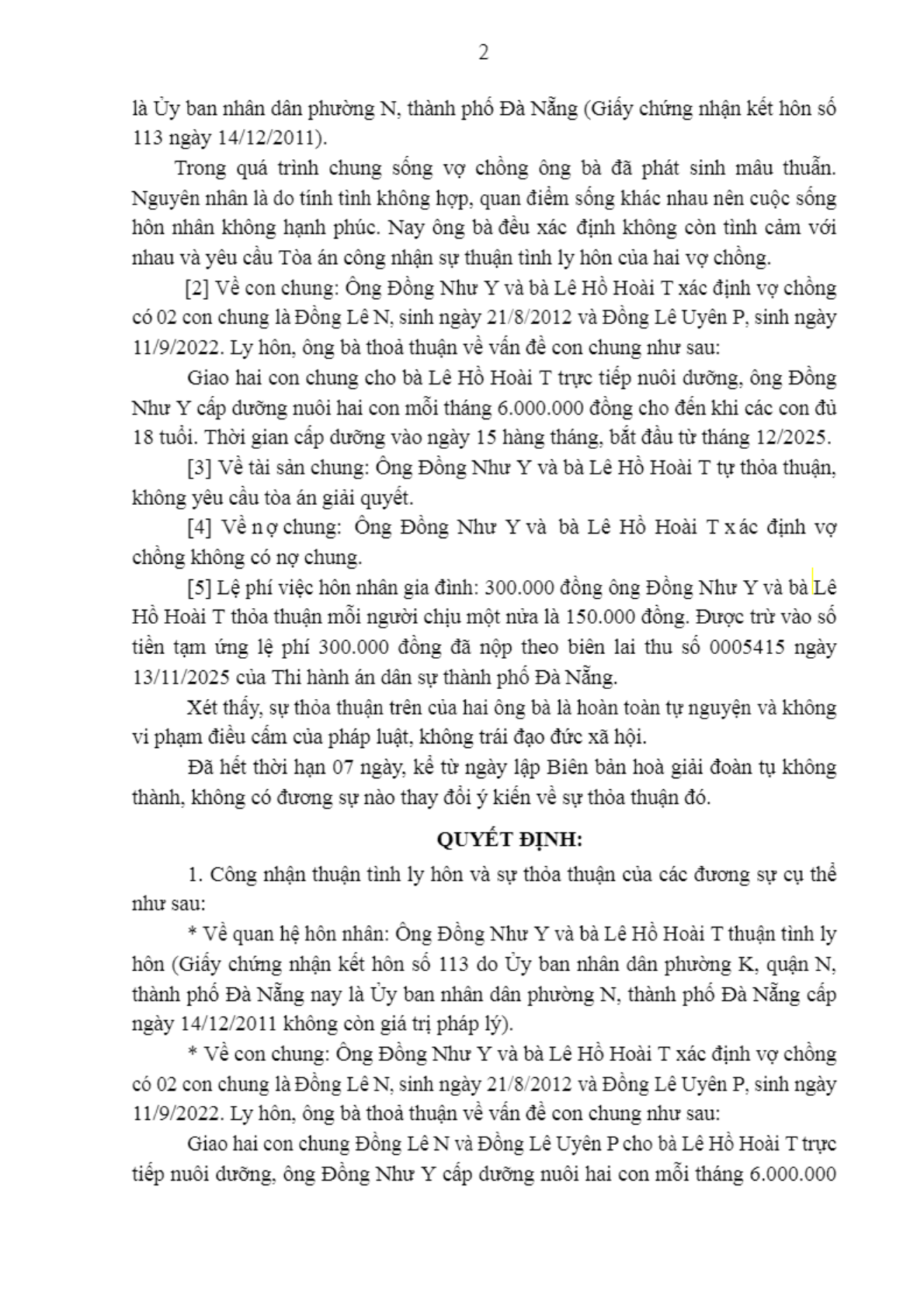 | Thông tin về vụ/việc: | Công nhận thuận tình ly hôn giữa Đồng Như Y và Lê Hồ Hoài T |
