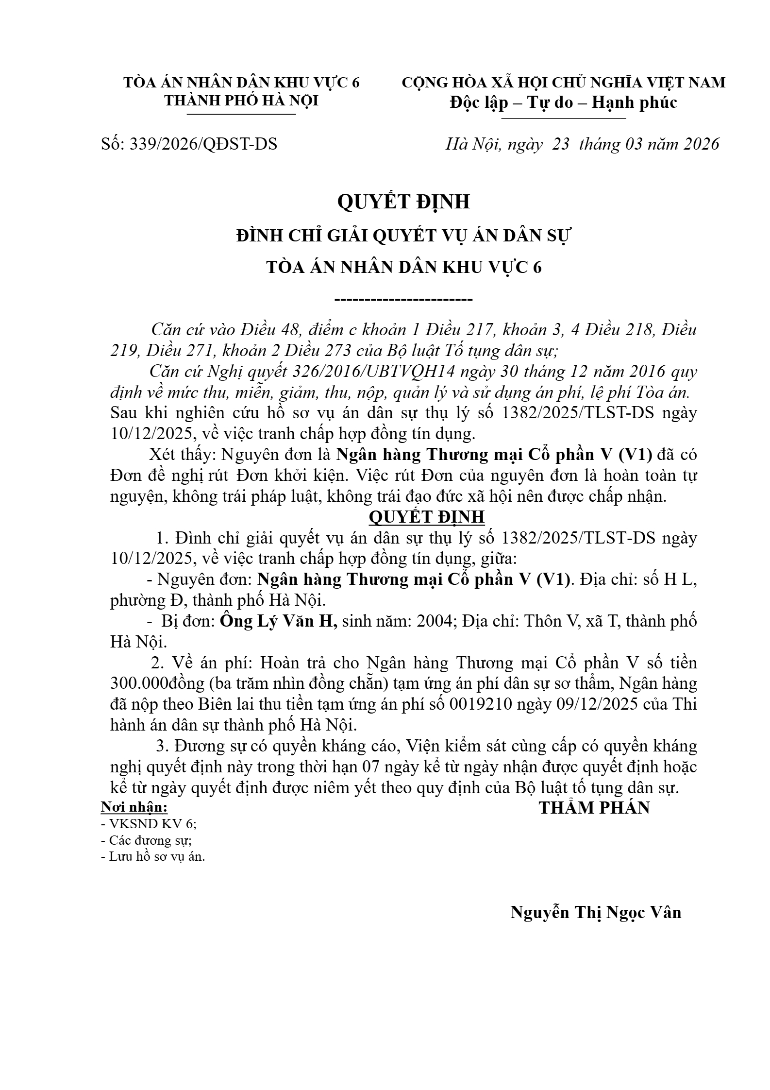 Quyết định số 339/2026/QĐST-DS ngày 23/03/2026 của Tòa án nhân dân khu vực 6 - Hà Nội, TP. Hà Nội về tranh chấp hợp đồng tín dụng