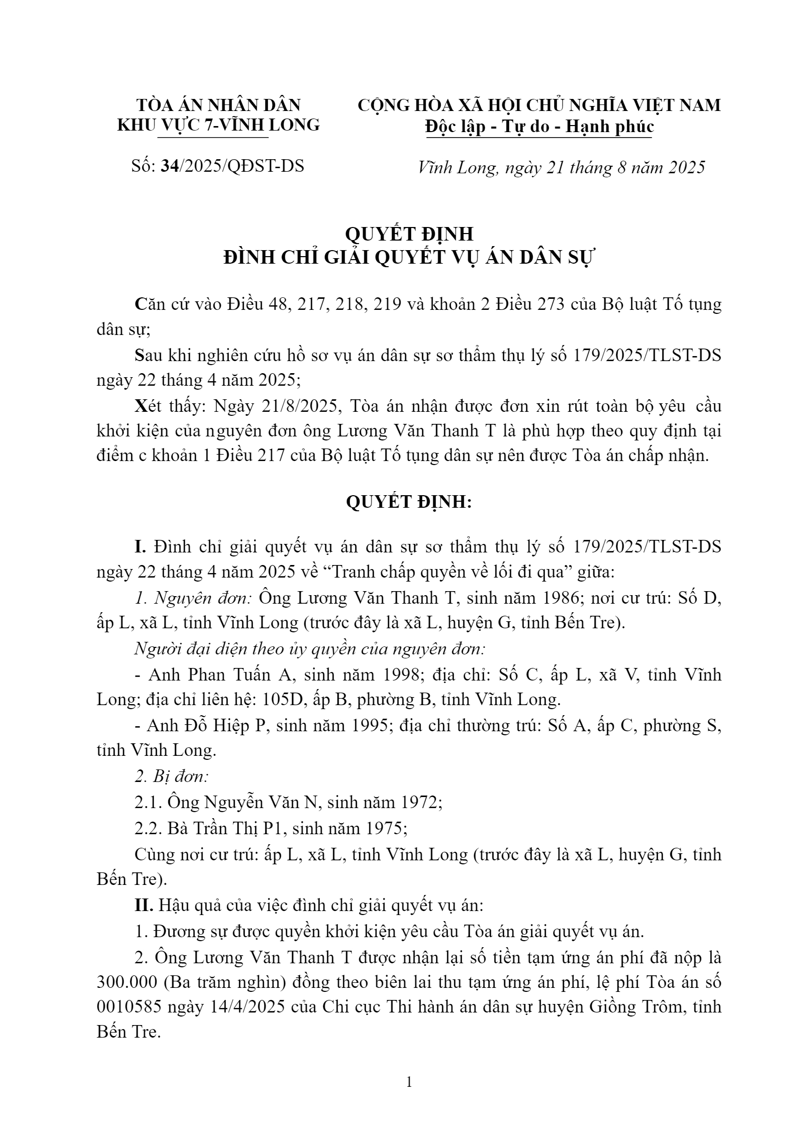 | Tòa án xét xử: | Tòa án nhân dân khu vực 7 - Vĩnh Long, tỉnh Vĩnh Long |