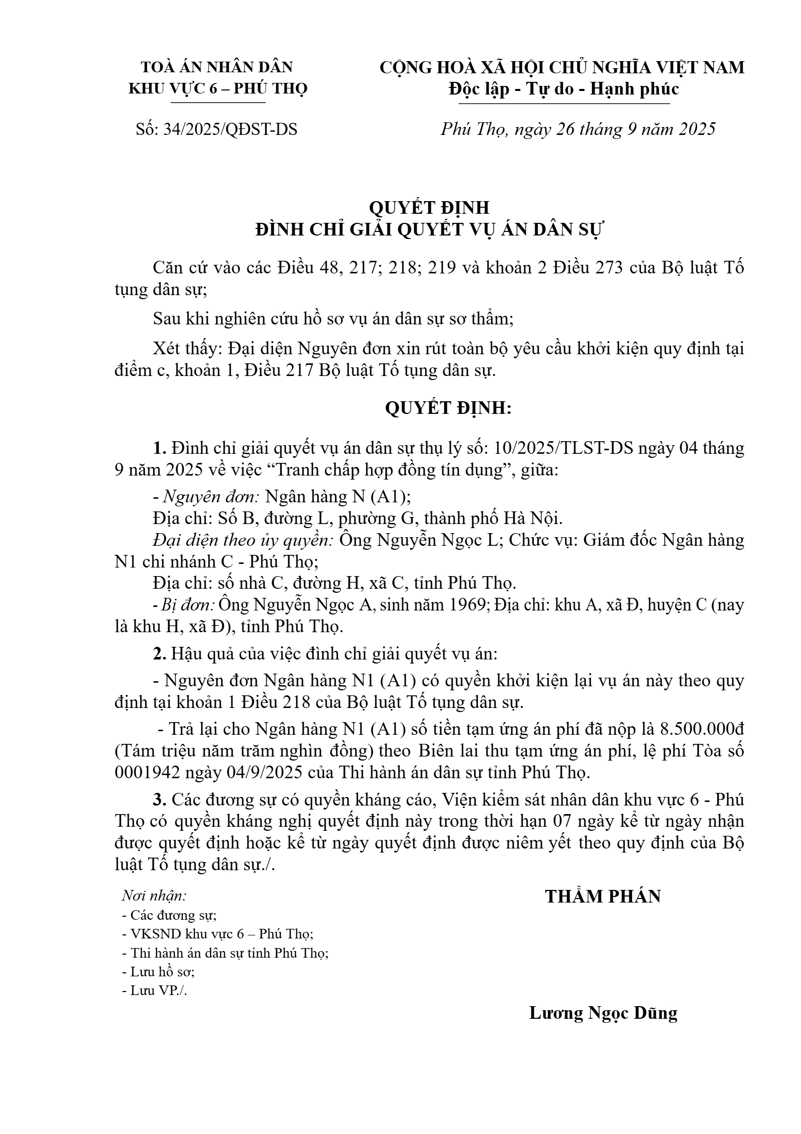 Quyết định số 34/2025/QĐST-DS ngày 26/10/2025 của Tòa án nhân dân khu vực 6 - Phú Thọ, tỉnh Phú Thọ về tranh chấp hợp đồng vay tài sản