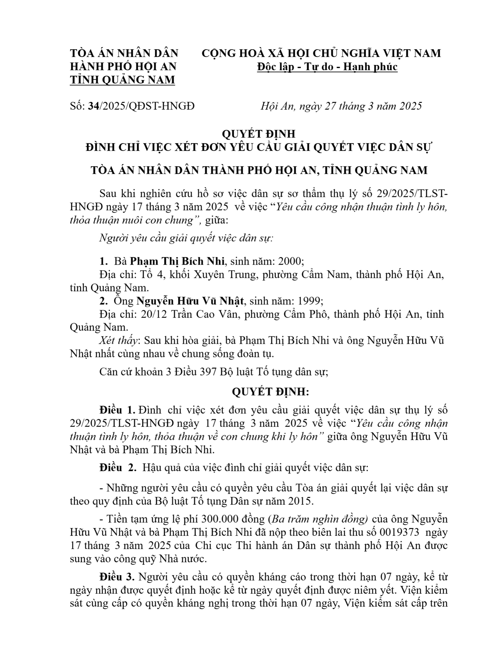 Quyết định số 34/2025/QĐST-HNGĐ ngày 27/03/2025 của TAND TP. Hội An, tỉnh Quảng Nam về yêu cầu công nhận thuận tình ly hôn