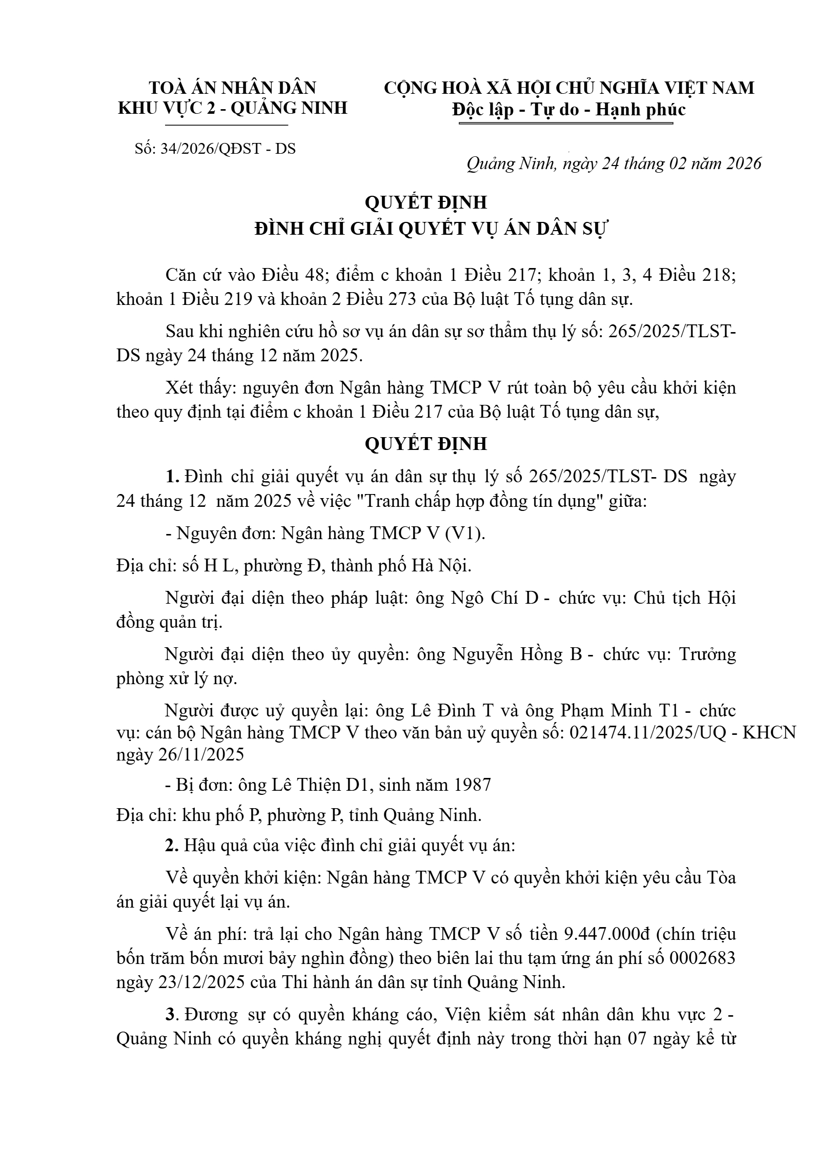 Quyết định số 34/2026/QĐST-DS ngày 24/02/2026 của Tòa án nhân dân khu vực 2 - Quảng Ninh, tỉnh Quảng Ninh về tranh chấp hợp đồng tín dụng