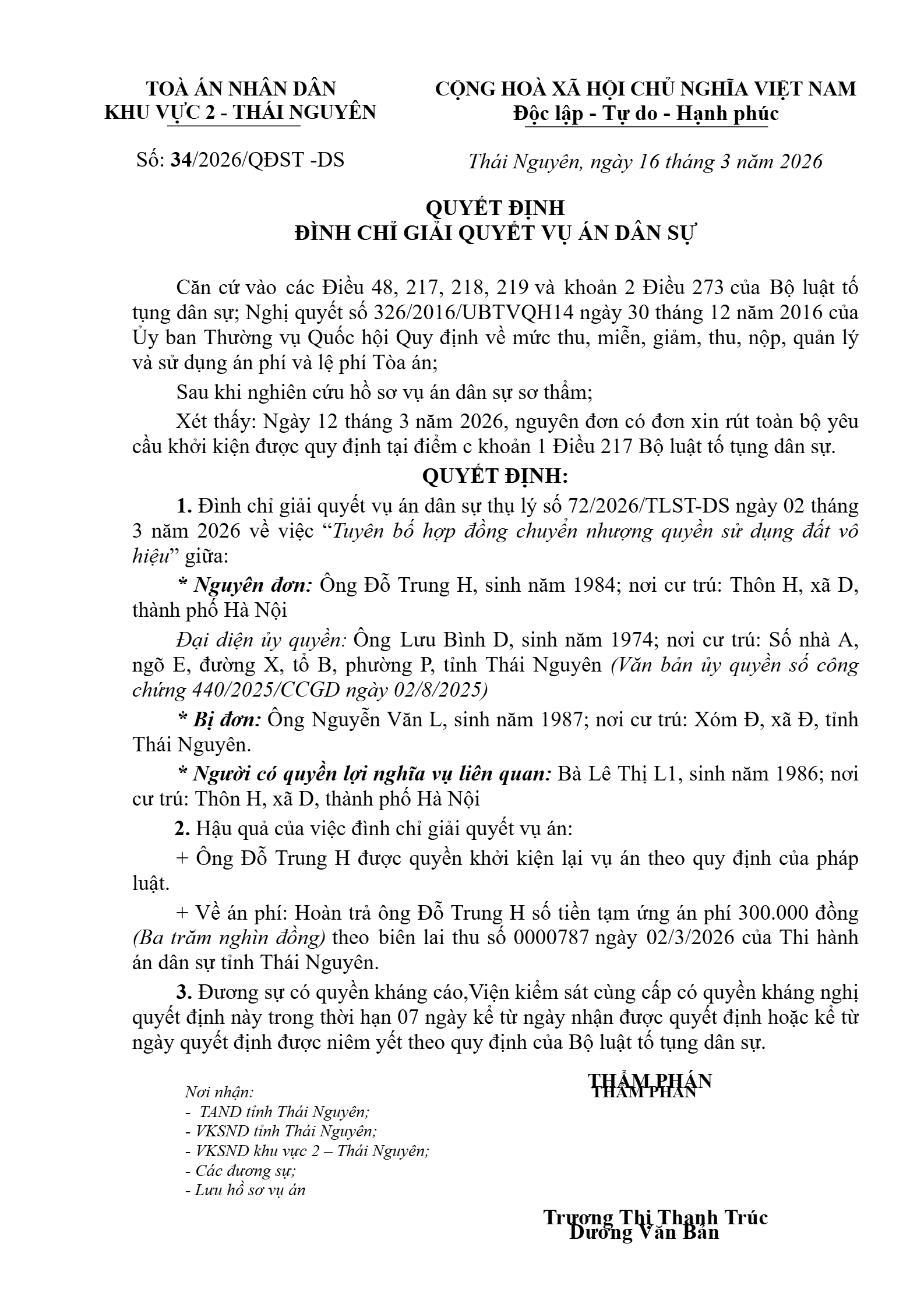 Quyết định số 34/2026/QĐST-DS ngày 16/03/2026 của Tòa án nhân dân khu vực 2 - Thái Nguyên, tỉnh Thái Nguyên về tranh chấp hợp đồng chuyển nhượng quyền sử dụng đất