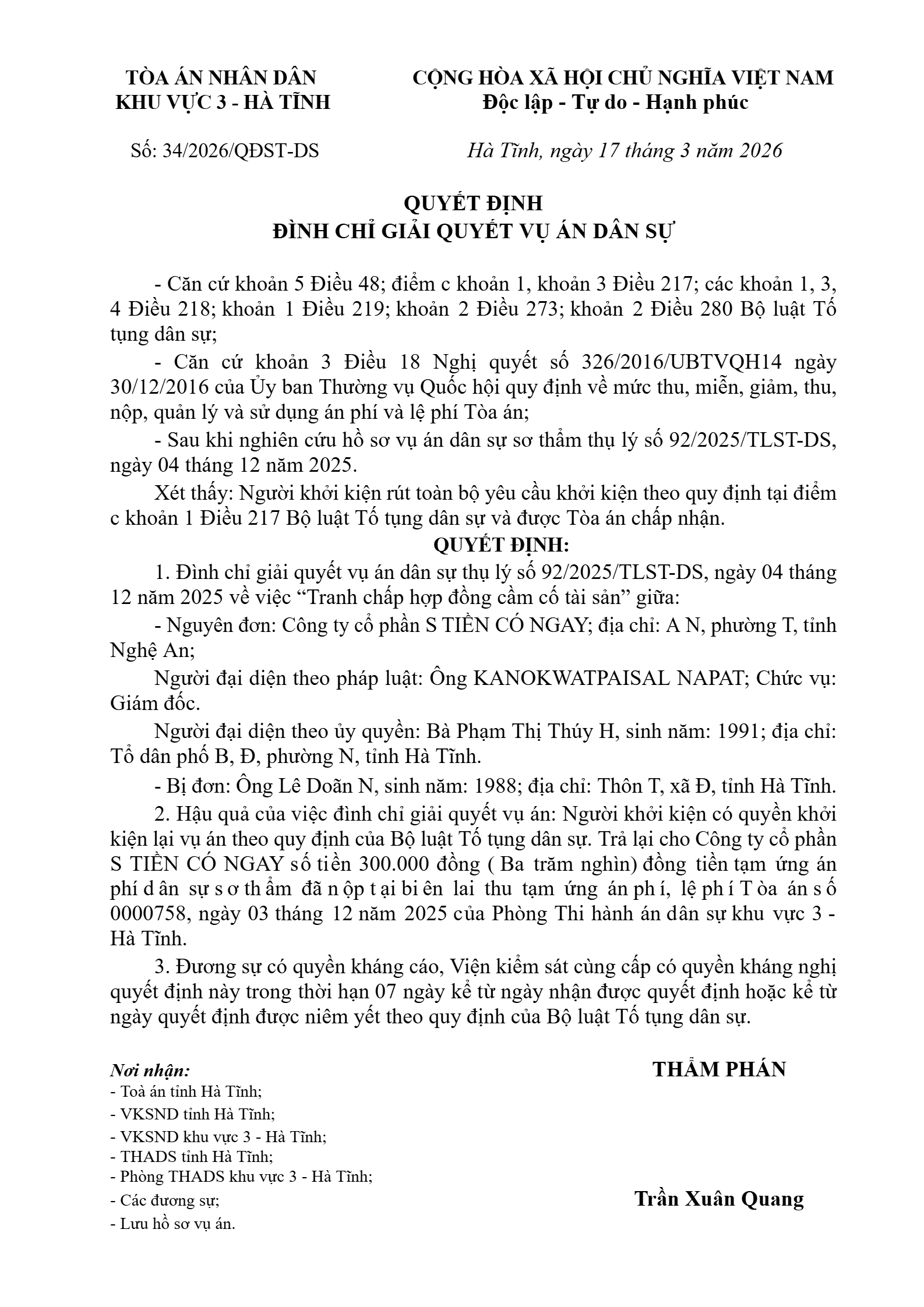 Quyết định số 34/2026/QĐST-DS ngày 17/03/2026 của Tòa án nhân dân khu vực 3 - Hà Tĩnh, tỉnh Hà Tĩnh về tranh chấp hợp đồng vay tài sản
