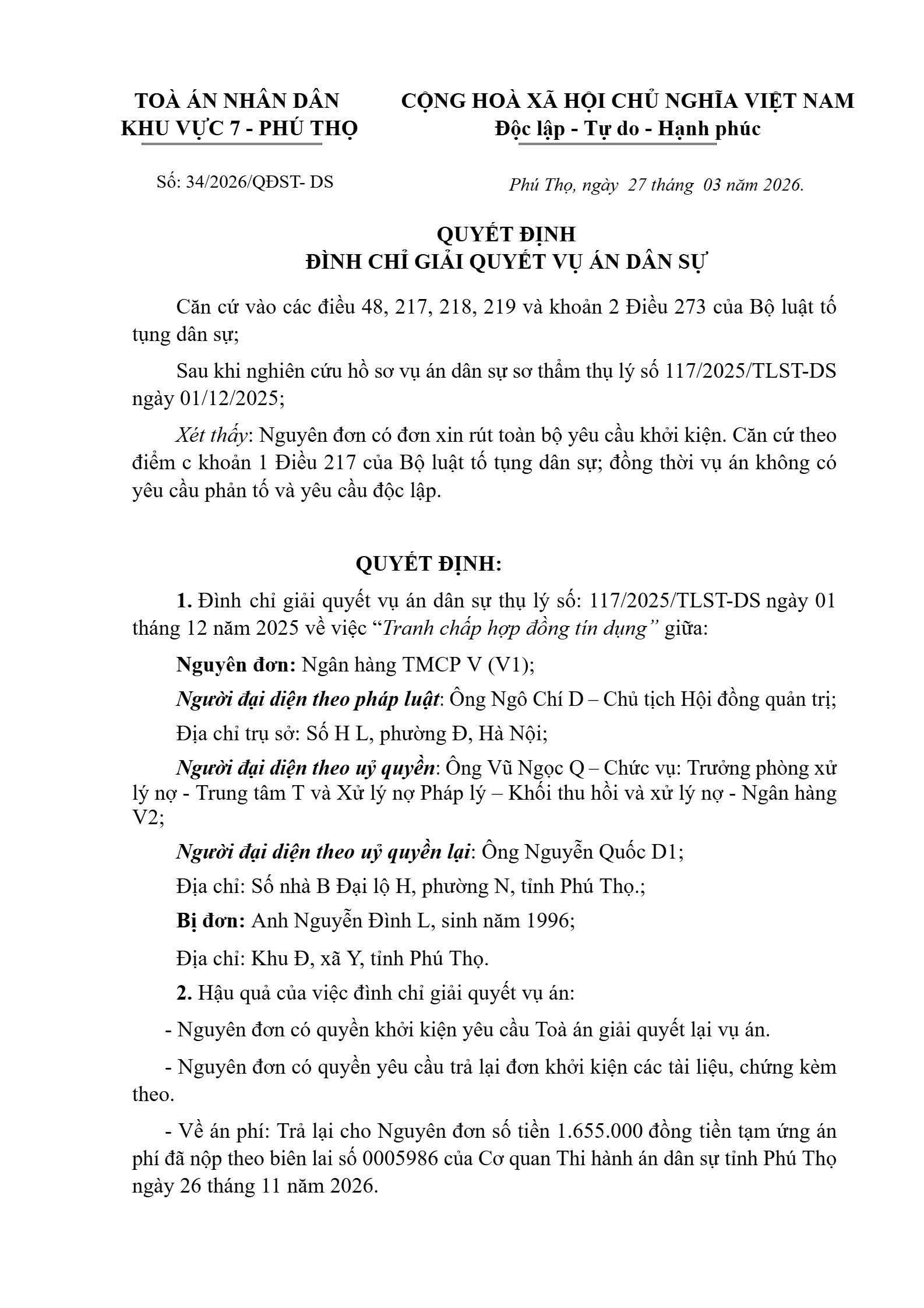 Quyết định số 34/2026/QĐST-DS ngày 27/03/2026 của Tòa án nhân dân khu vực 7 - Phú Thọ, tỉnh Phú Thọ về tranh chấp hợp đồng tín dụng