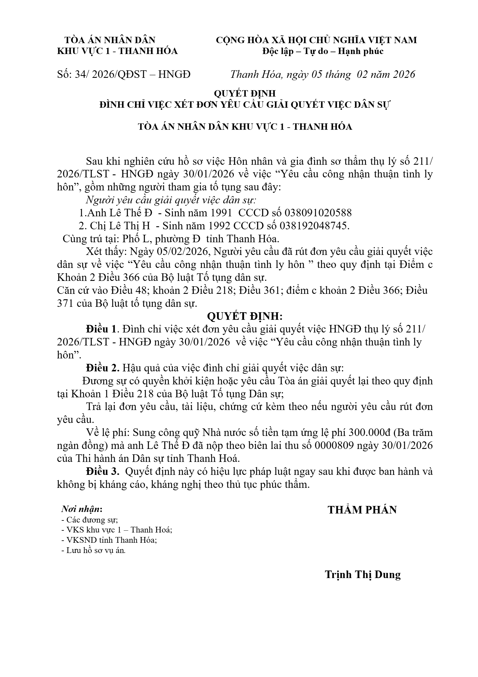 | Tên Quyết định: | Quyết định số 34/2026/QĐST-HNGĐ ngày 05/02/2026 của Tòa án nhân dân khu vực 1 - Thanh Hóa, tỉnh Thanh Hóa về yêu cầu công nhận thuận tình ly hôn |