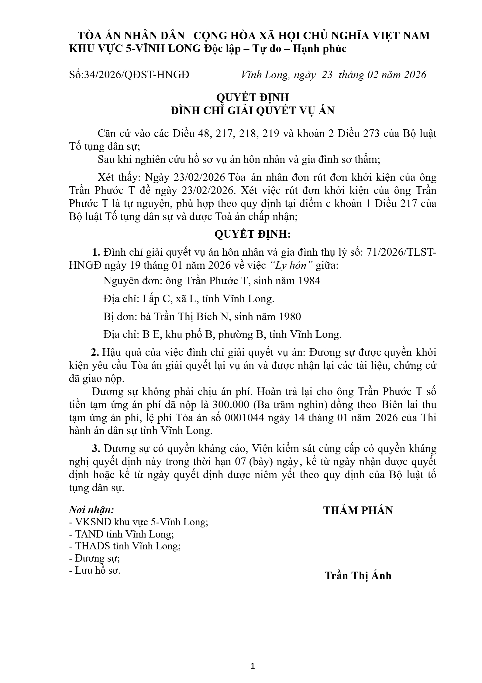 Quyết định số 34/2026/QĐST-HNGĐ ngày 23/02/2026 của Tòa án nhân dân khu vực 5 - Vĩnh Long, tỉnh Vĩnh Long về vụ án ly hôn về mâu thuẫn gia đình