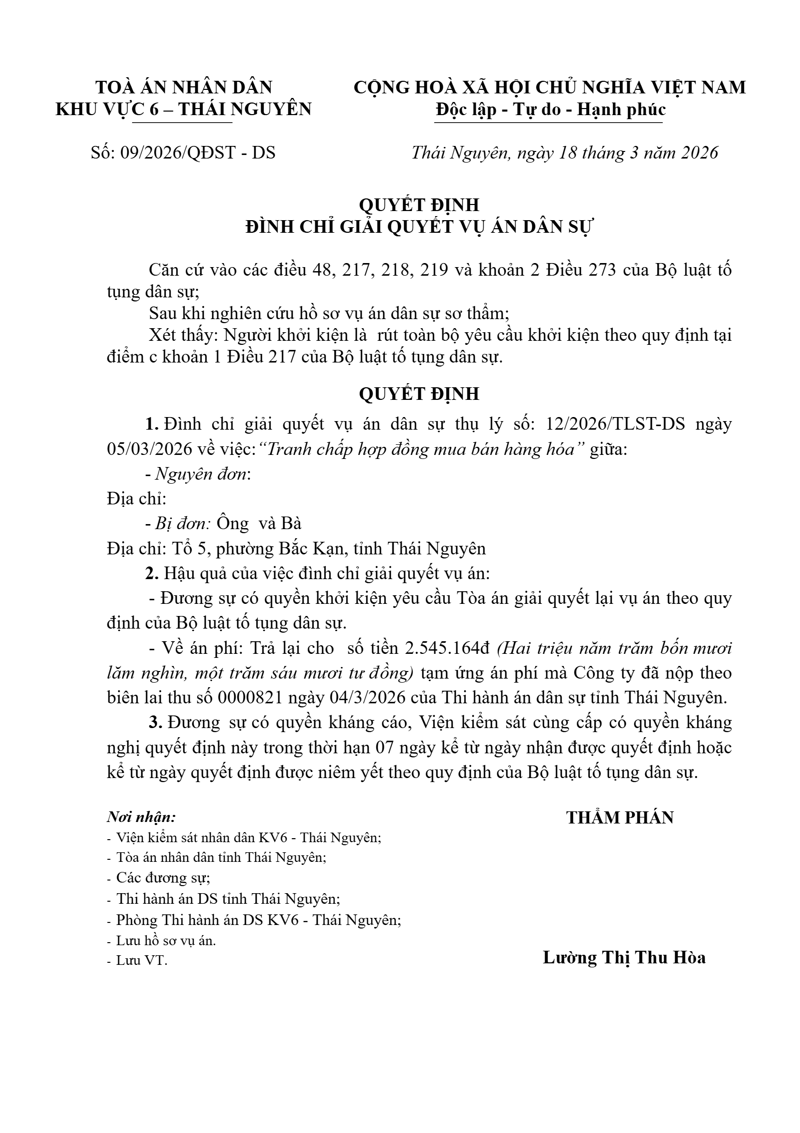 | Tòa án xét xử: | Tòa án nhân dân khu vực 6 - Thái Nguyên, tỉnh Thái Nguyên |
